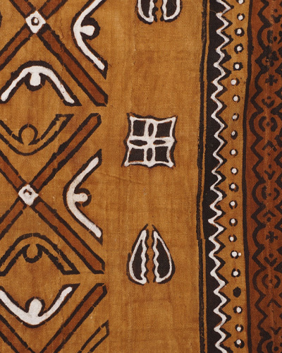 ボゴランフィニは、植物由来の染料や泥を使って模様を描く伝統技術で、主にコットン布に染色されます。