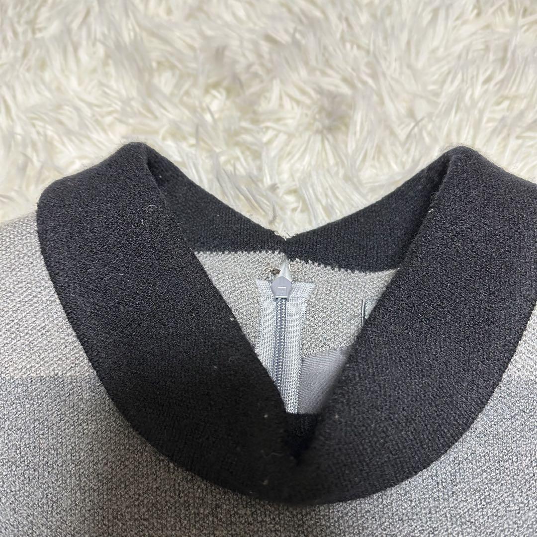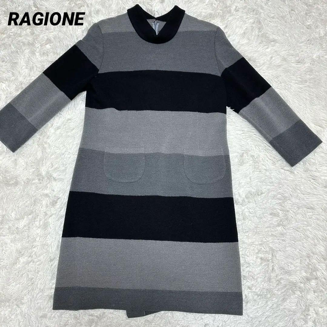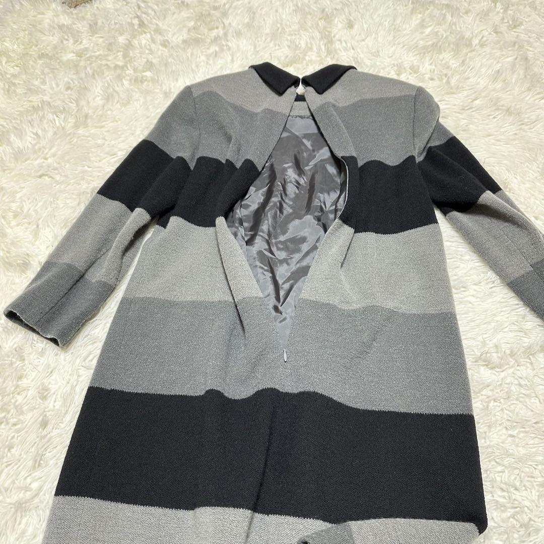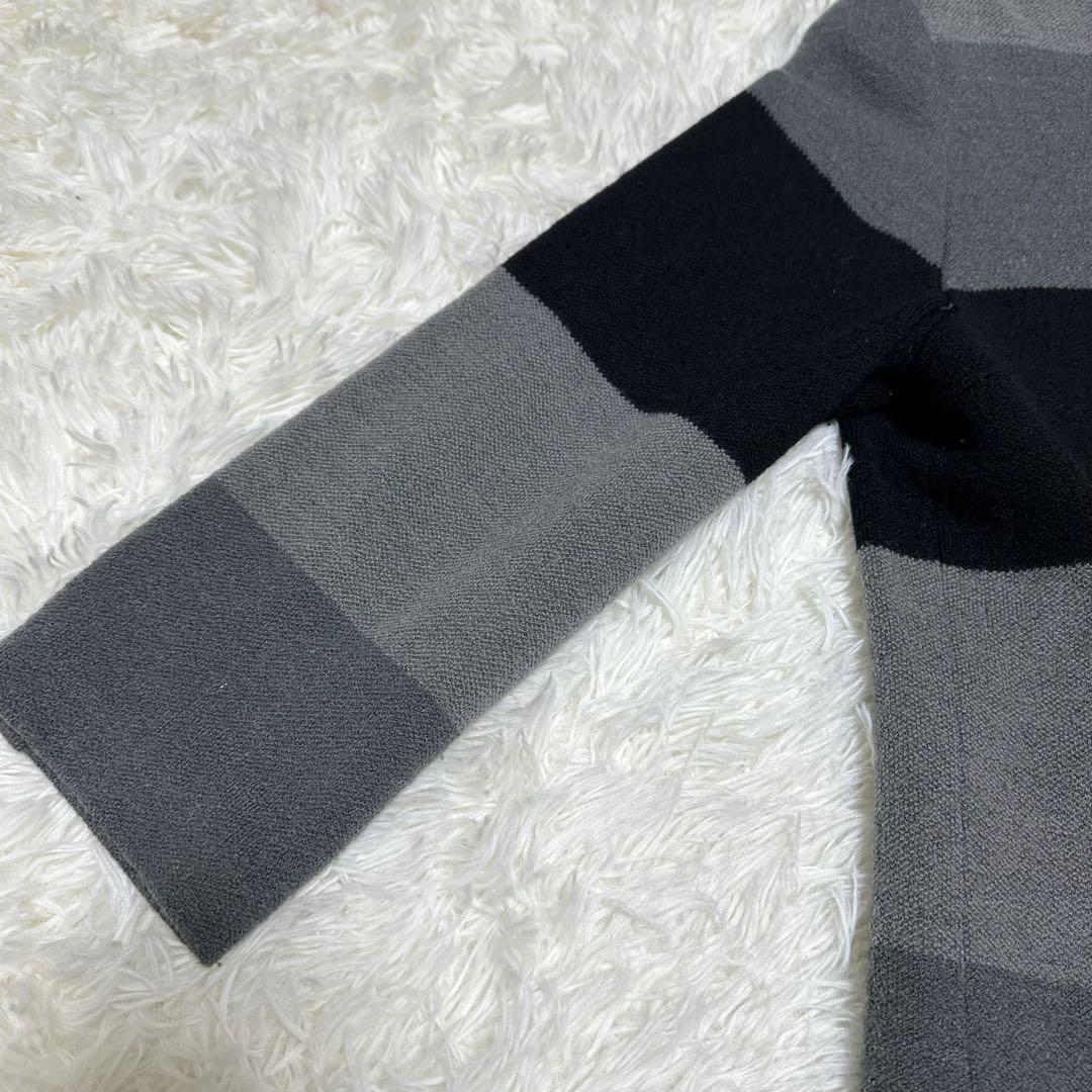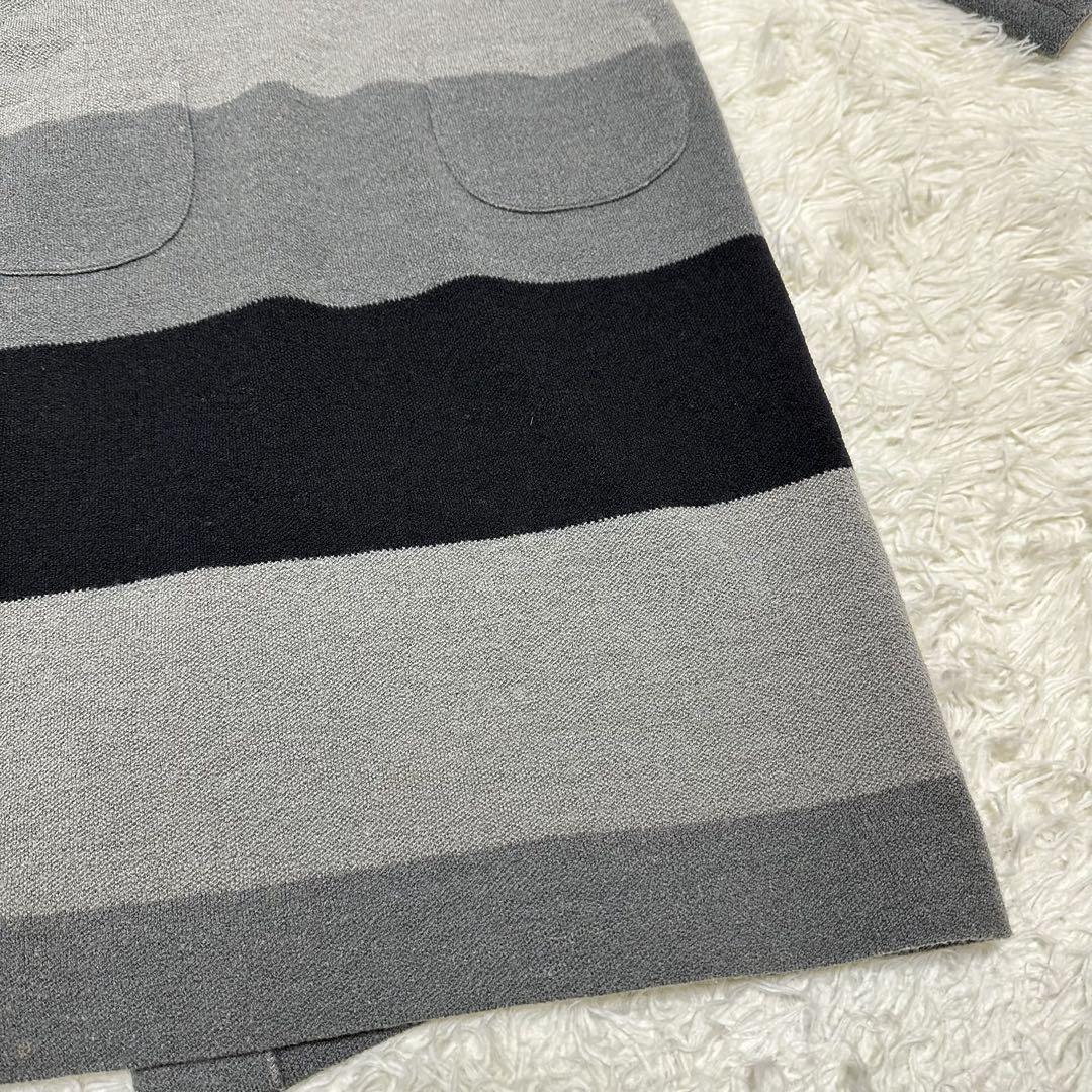 グレーと黒のストライプデザイン、ポケット付きのニットワンピース。