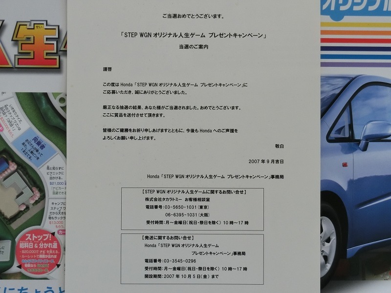 ご覧いただきまして有難うございます。 【懸賞当選品】人生ゲーム HONDA STEP WGN 非売品 タカラトミー ホンダ ステップワゴン 新品未使用 の出品です。 ■ 2007年 HONDA 「STEP WGN オリジナル人生ゲーム プレゼントキャンペーン」 ■ 配送梱包用外箱に入れた状態で保管していました。 ※ 新品の商品ですが、長期保管品です外箱等の細かいキズ等が気になる方は入札をご遠慮下さい。 どうぞよろしくお願い致します。 | |||