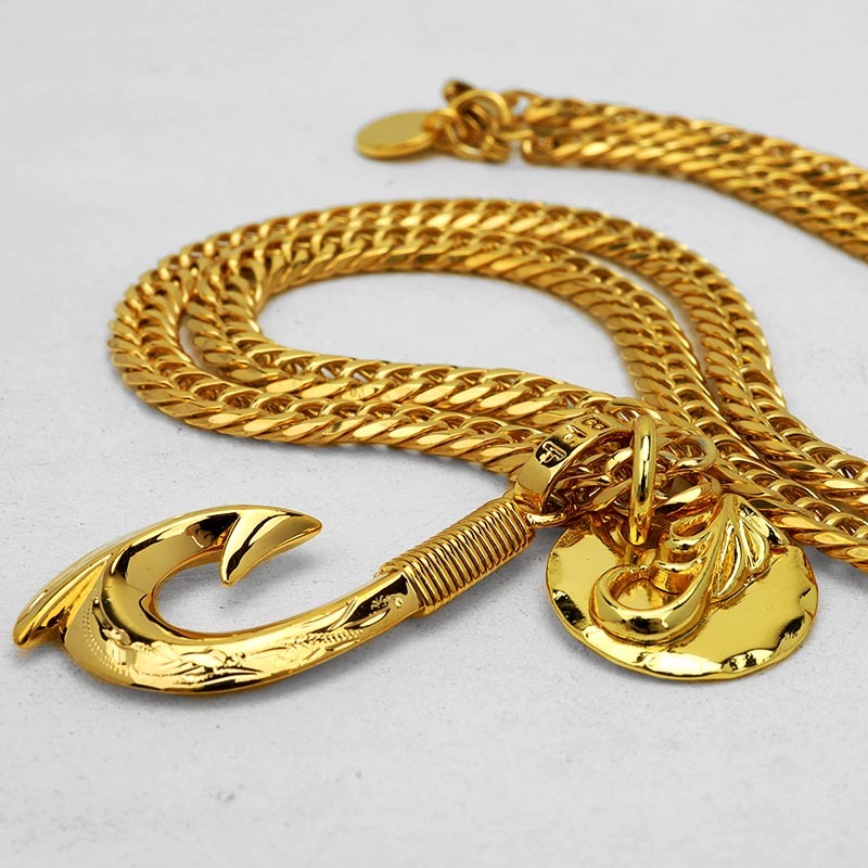 密度が高くユニークに首元をアピールするダブル喜平チェーンにハワイアンテイストのフィッシュフックトップを据えたネックレス。アクセントにTURQUOISEシリーズの唐草メタルをセット。ダブル喜平は6面カット仕様で様々な光を反射しハワイアンテイストのトップと程よくマッチ。