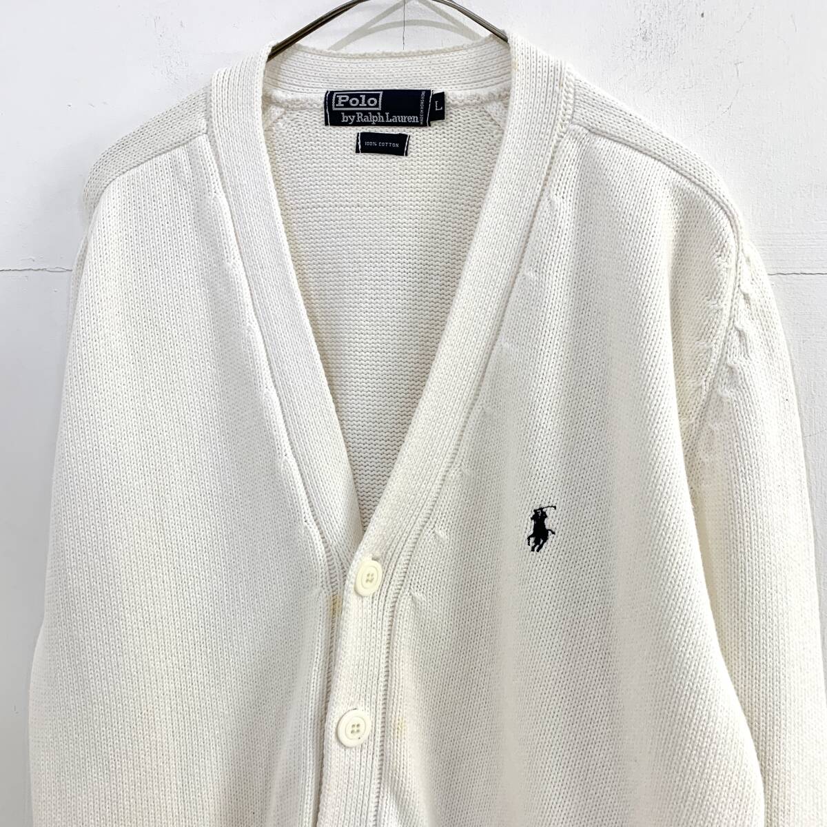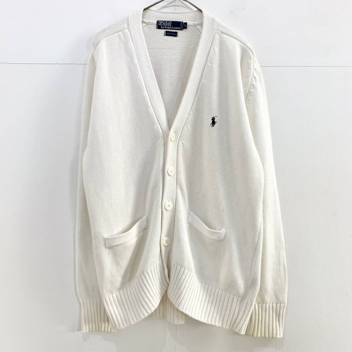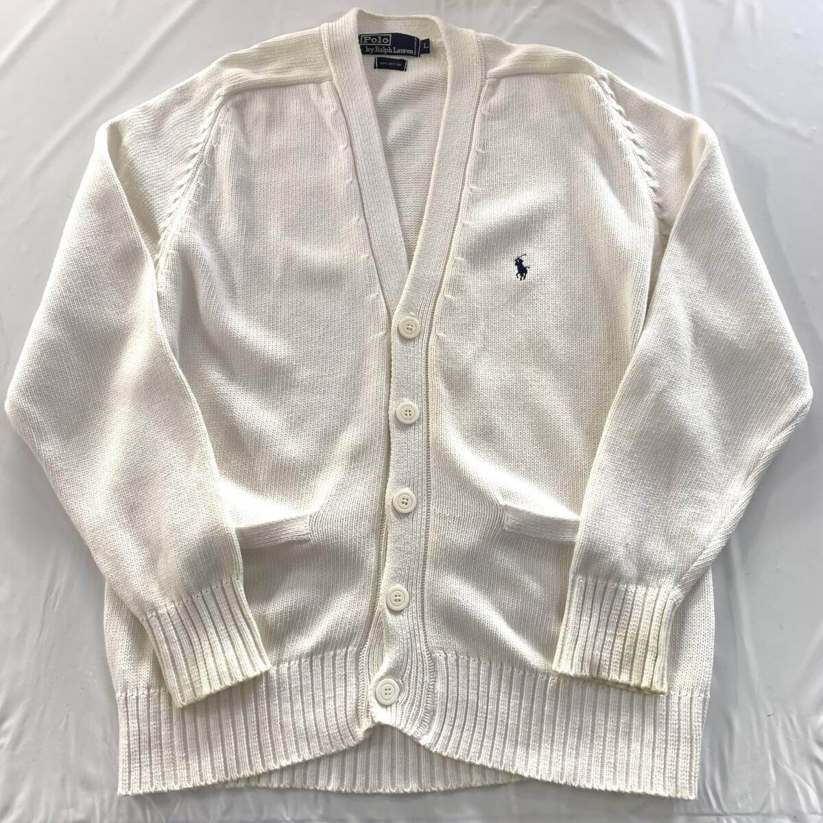 ☆Polo by Ralph Lauren ラルフローレン 90s Vintage Vネックコットンニットカーディガン ホワイト系 サイズL 綿【送料一律/同梱可能】K