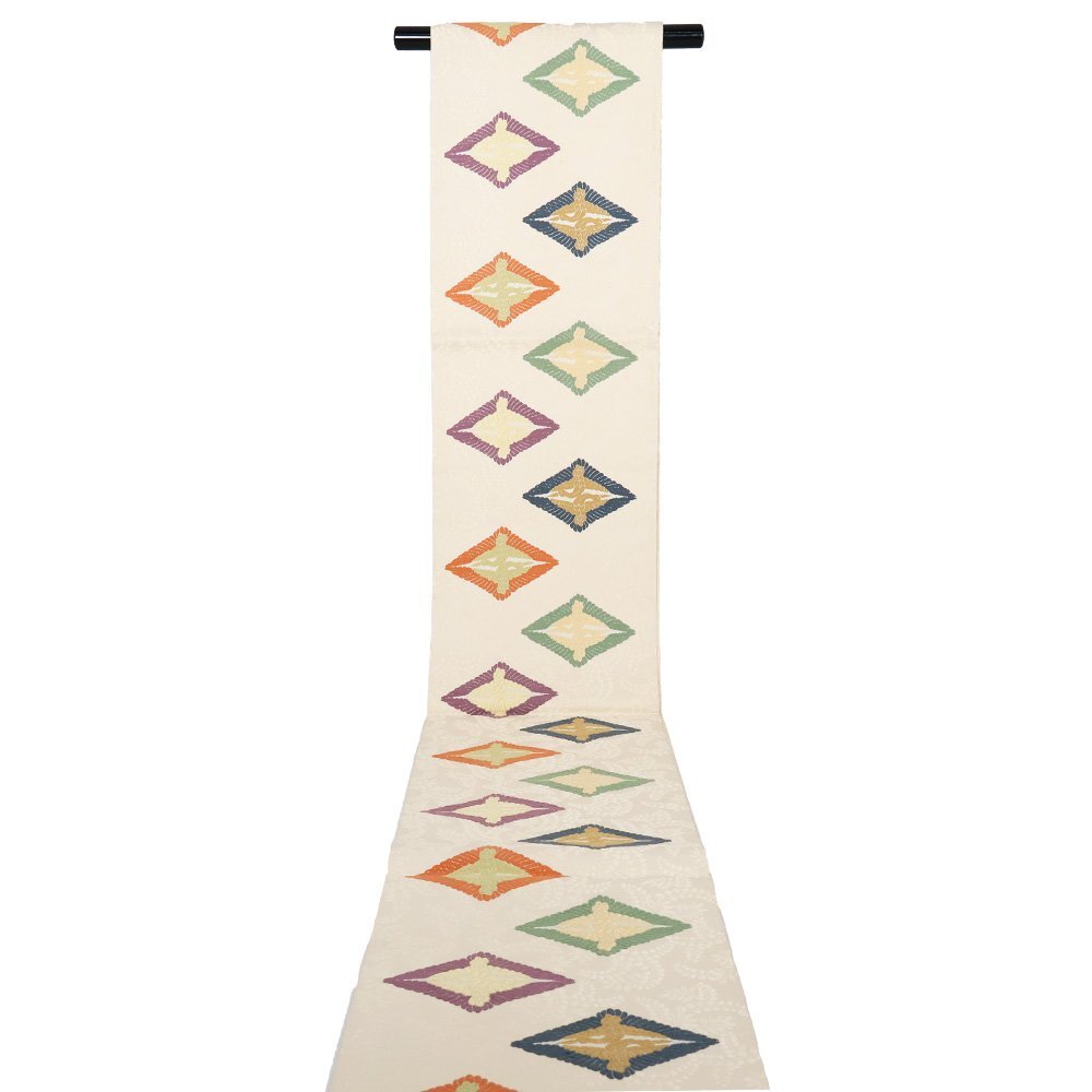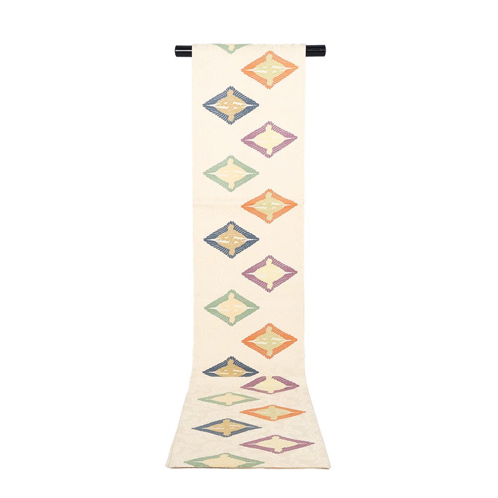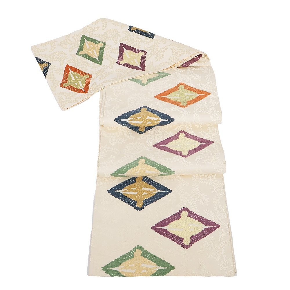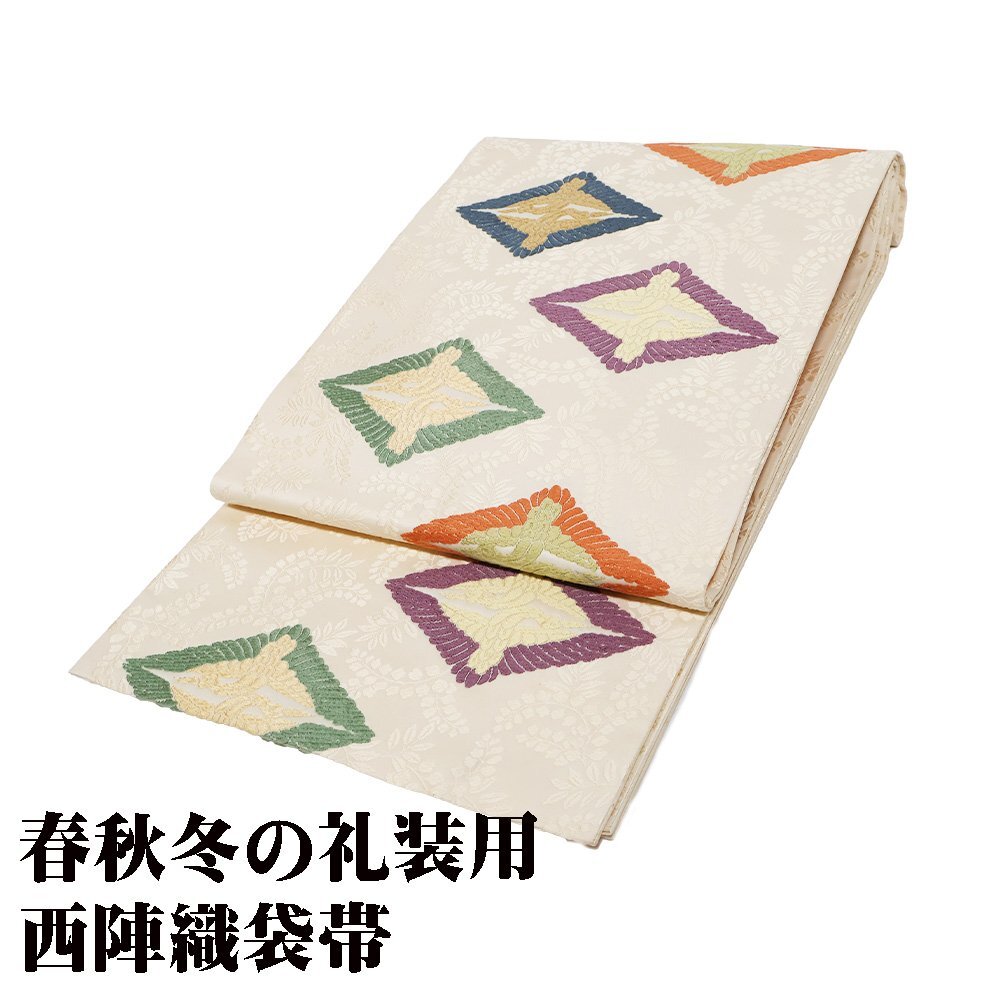 | 西陣織袋帯 ベージュ地 唐織・向い鶴 全通 未使用品 仕立て上がり |
