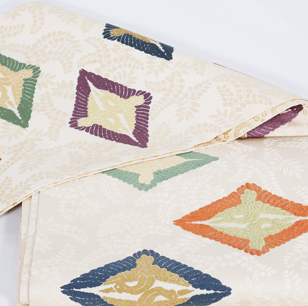 西陣織袋帯 ベージュ地 唐織・向い鶴 全通 (写真では上手く色が出ない場合があります。ご了承下さい) ※お使いのディスプレイの種類や設定の差により 実物の色と画像の色が少々異なることもございます。 |