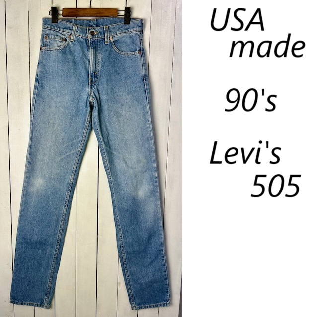 ●商品説明・・・90年代(95年製)のオールド・ヴィンテージのリーバイス 505 デニムパンツです。501よりも若干スリムなストレートシルエットです。自然ななフェード感・色落ち・当たりなどの経年変化の出たブルージーンズで、グランジやオールドサーフ感のある春夏にぴったりなフェードデニムです。こちらはレングス長めの一着です。今では希少となったmade in USA (アメリカ製・工場番号501)です。サイズ表記は29で、XS~S程度のサイズ感かと思います。
