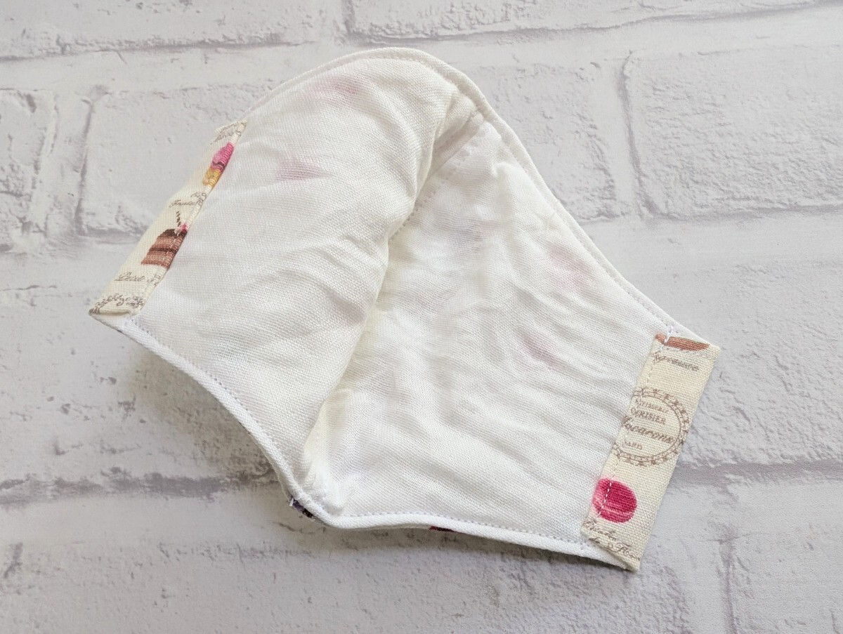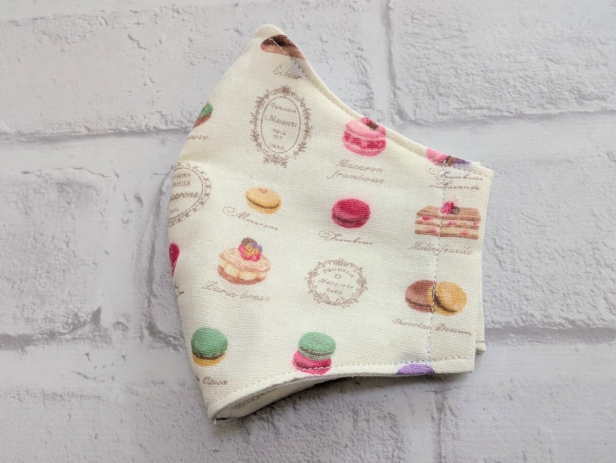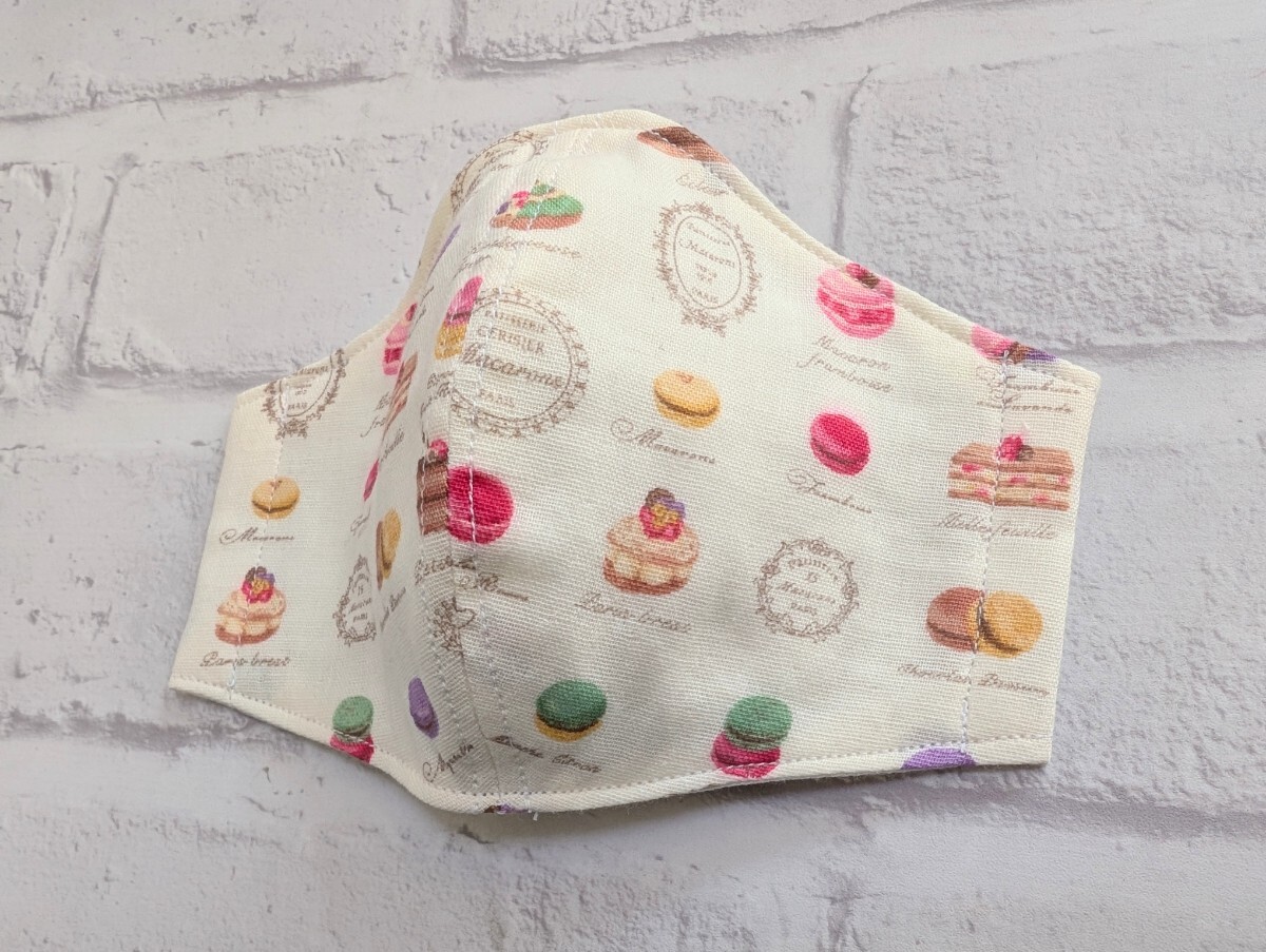 表地裏地共にダブルガーゼを使用した立体インナーマスクです。オフホワイトの生地にマカロン柄です。
