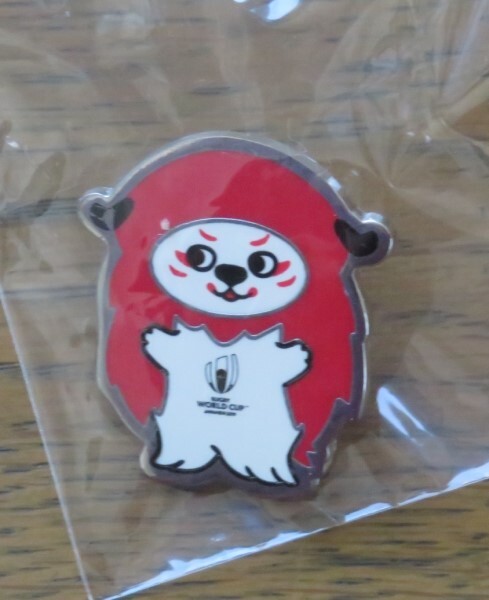 ラグビーワールドカップ2019の公式ピンバッジのレンジ―(大会マスコット赤)と大会ピンバッジの2点セットです。