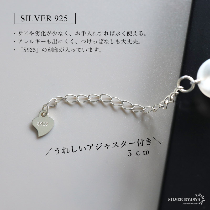 シルバー925は、銀含有率(純度)92.5%を示し、一般的に純銀として扱われています。サビや劣化等がほとんどなく金属アレルギーも出にくいとされており、アクセサリーとして重宝される金属です。