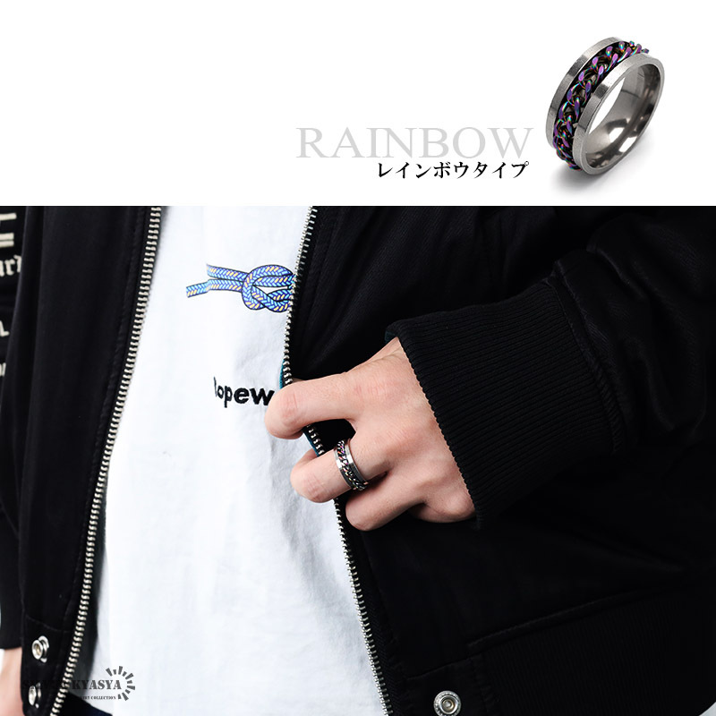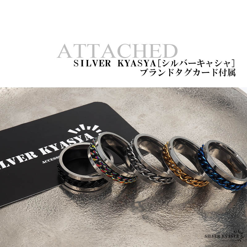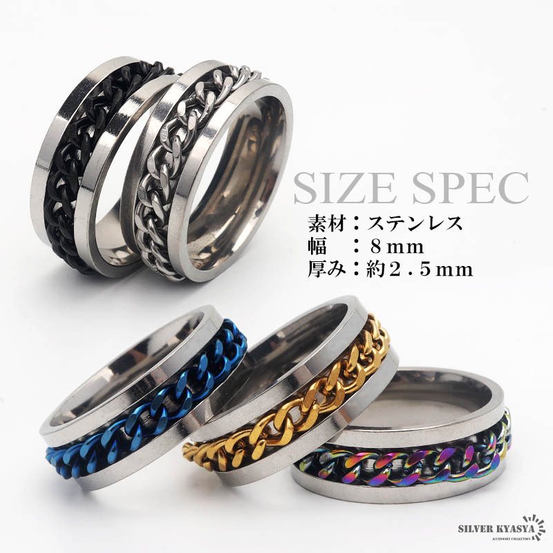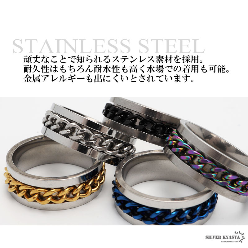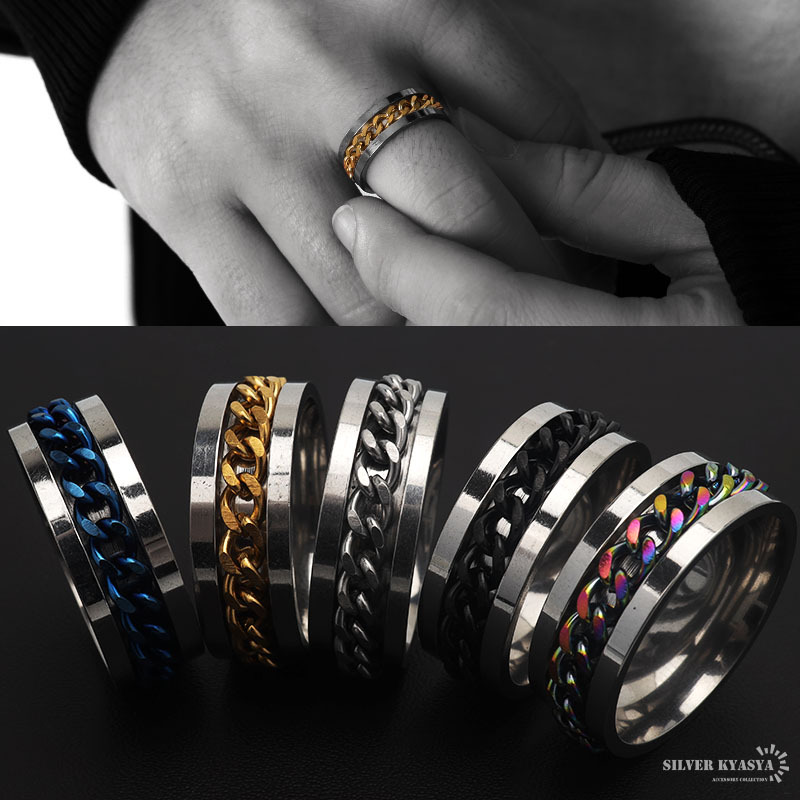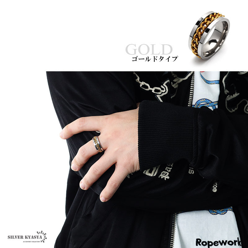 ステンレス特有の鈍い輝きを放つリングのセンターに喜平チェーンをセットしたリング。指元のアクセントに最適なインパクトのあるデザインが特徴です。