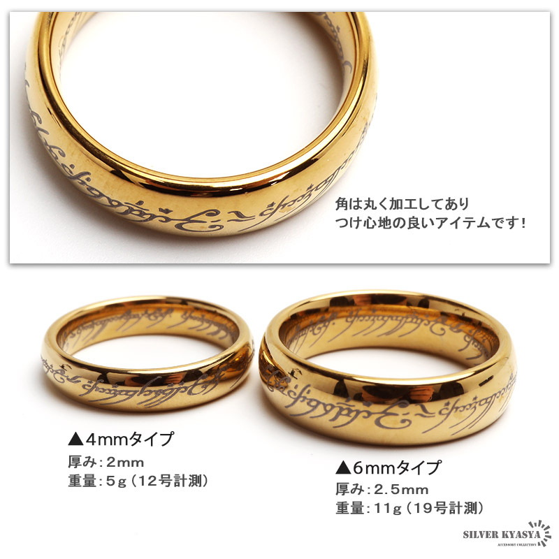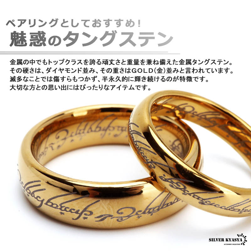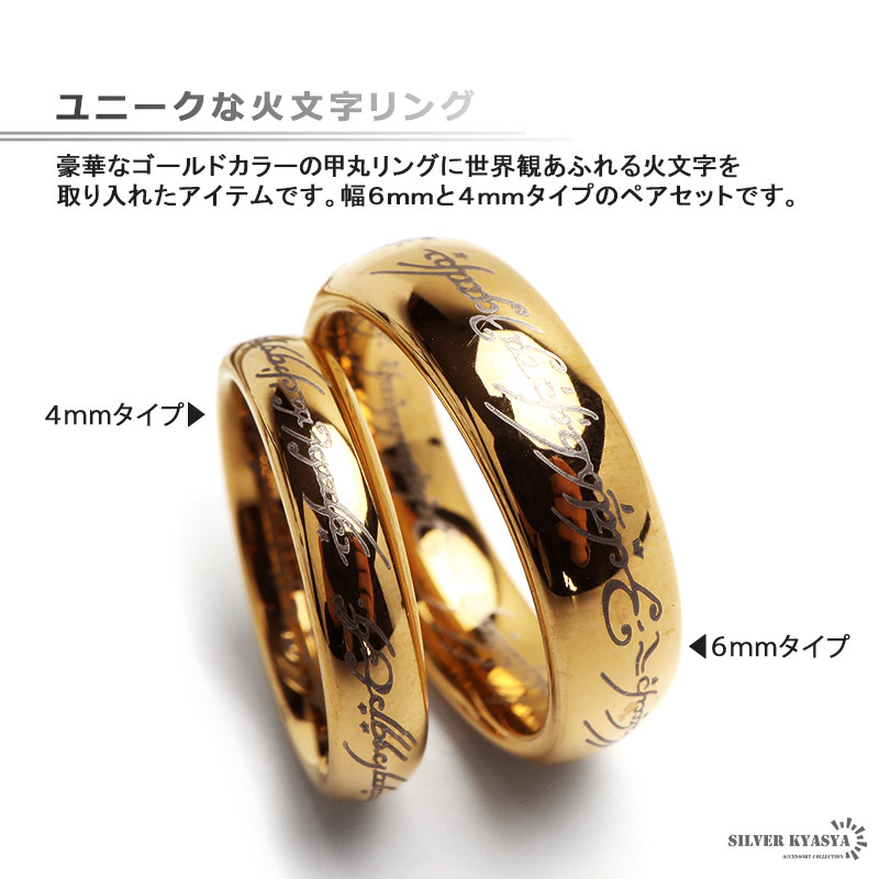 | 商品概要 | ■ユニークな火文字リング 豪華なゴールドカラーの甲丸リングに世界観あふれる火文字を取り入れたアイテムです。幅6mmと4mmタイプのペアセットです。 ■タングステンとは とても硬く、とても重たく、そして熱に強い、金属トップクラスの頑丈さを誇り、その硬さはあのダイヤモンドに次ぎ、滅多なことでは傷すらつきません。比重はgold(金)とほぼ同じで、見た目以上の重量感を感じられます。金属アレルギーも出にくいとされます。希少性が高く、レアメタル(希少金属)として取引される金属です。アクセサリーとしては、その丈夫さからエンゲージリングやマリッジリングなど半永久的に使用できる特性を活かした利用方法で愛されています。 |