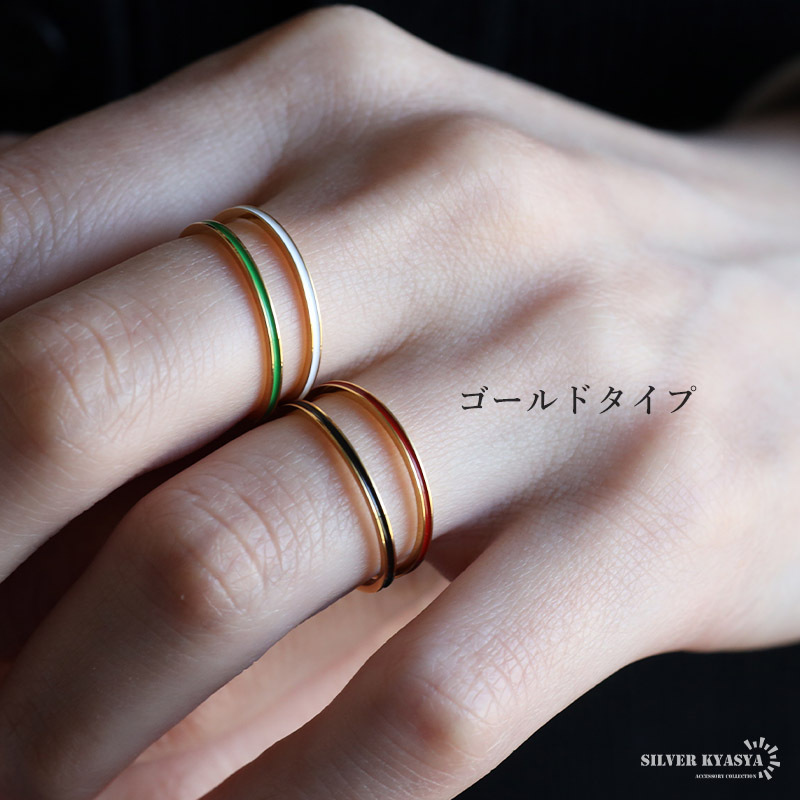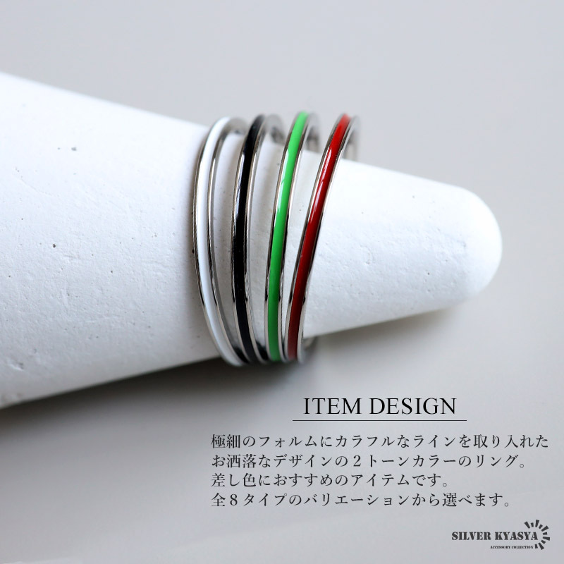 極細のフォルムにカラフルなラインを取り入れたお洒落なデザインの2トーンカラーのリング。差し色におすすめのアイテムです。全8タイプのバリエーションから選べます。