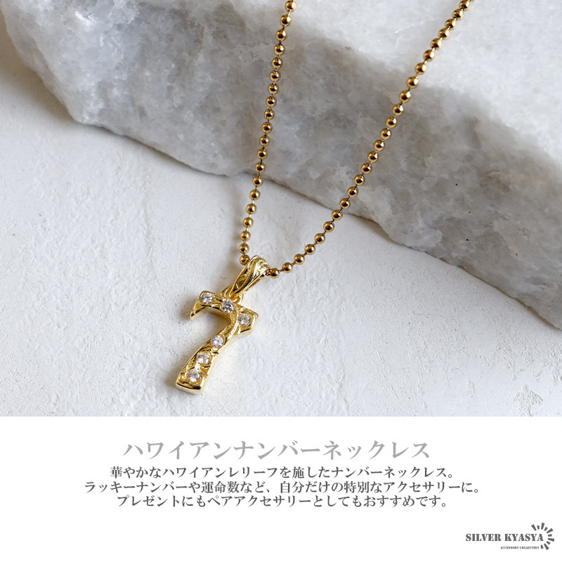 華やかなハワイアンレリーフを施し、ジルコニアを据えたナンバーネックレス。ラッキーナンバーや運命数など、お好きな数字を選べば、自分だけの特別なアクセサリーになること間違い無し!大切な人への贈り物にもぴったりのアイテムです。