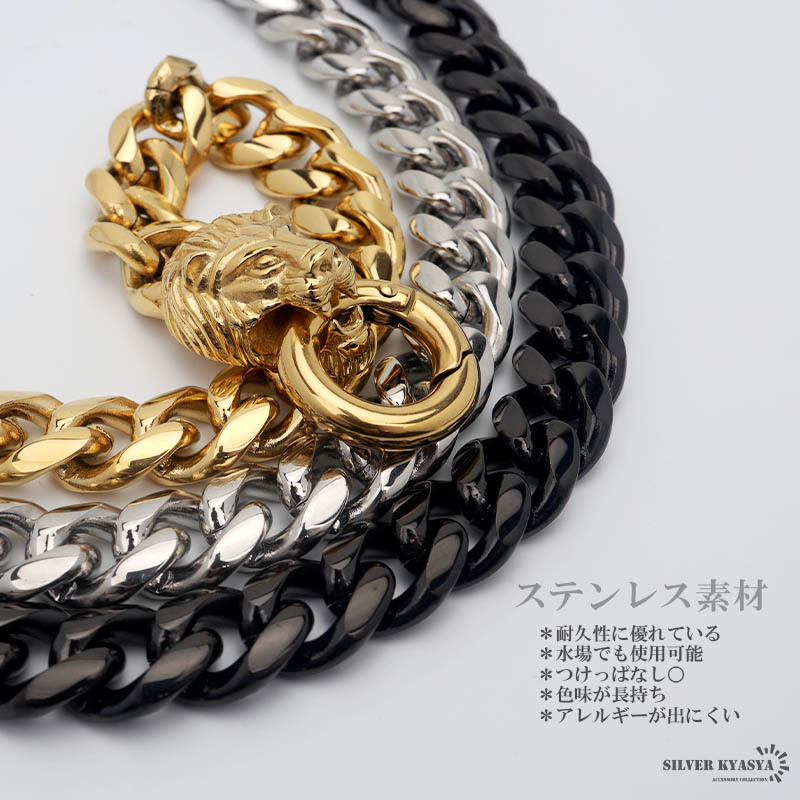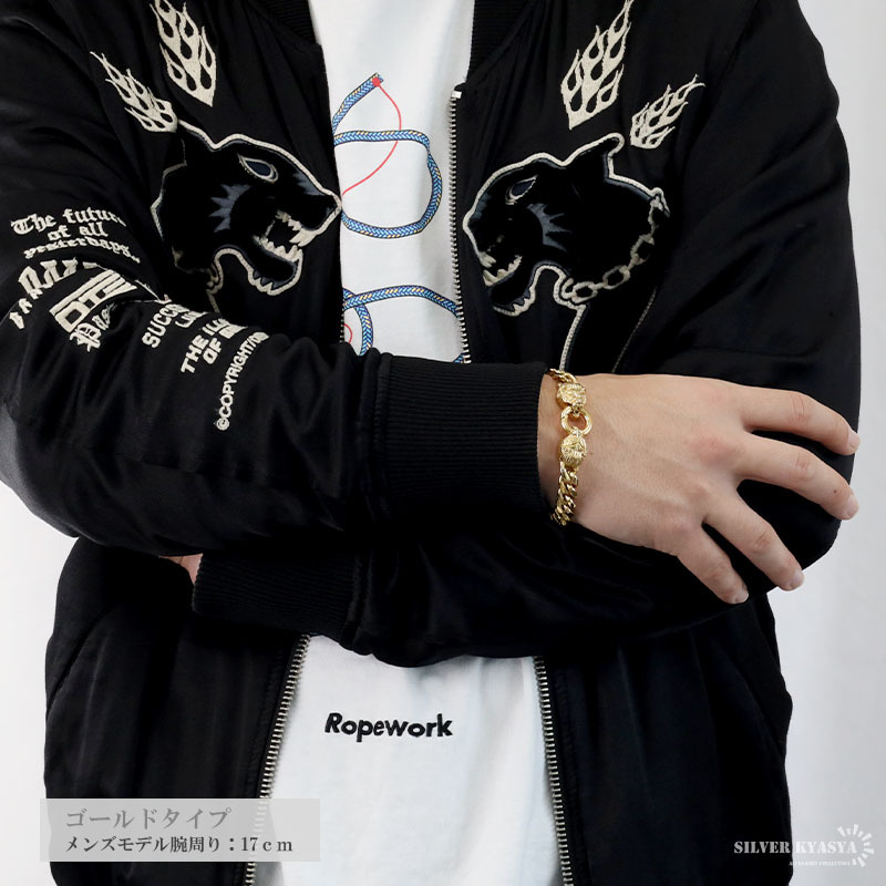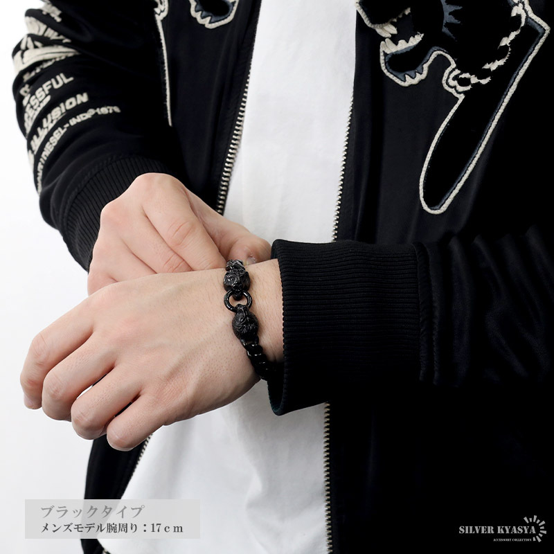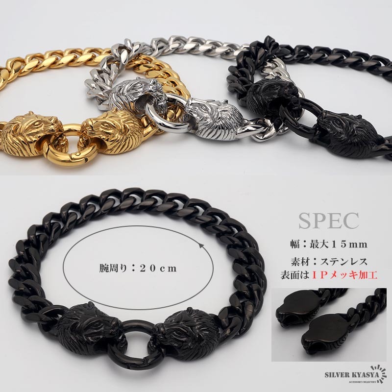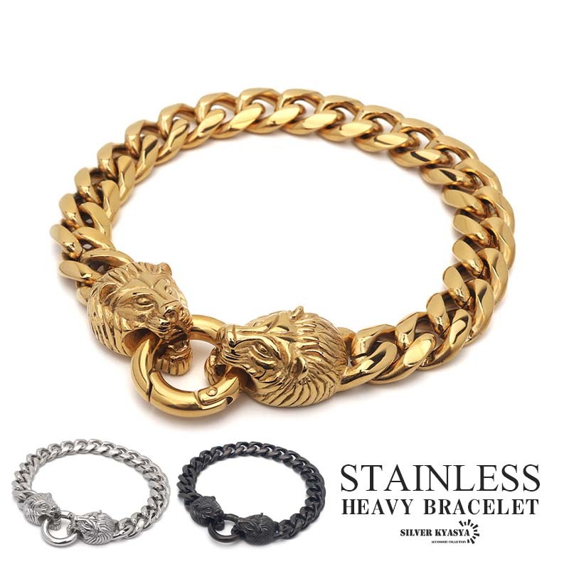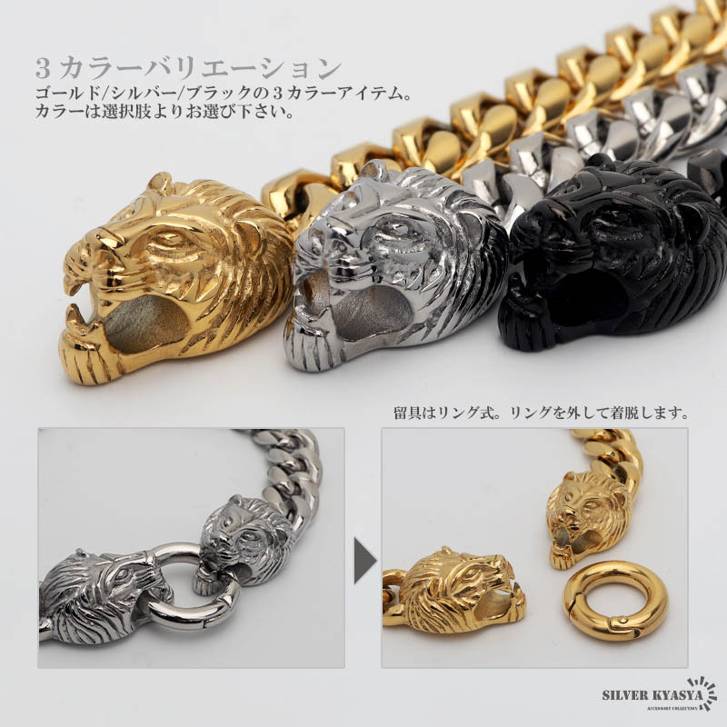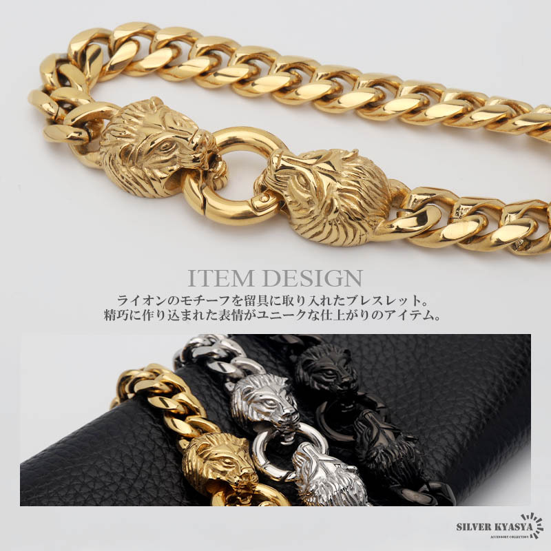 ライオンのモチーフを留め具に取り入れたブレスレット。精巧に作り込まれた表情がユニークな仕上がりのアイテム。ゴールド、シルバー、ブラックの3カラー。