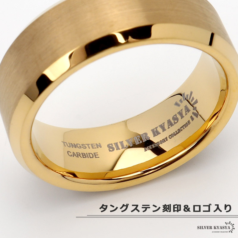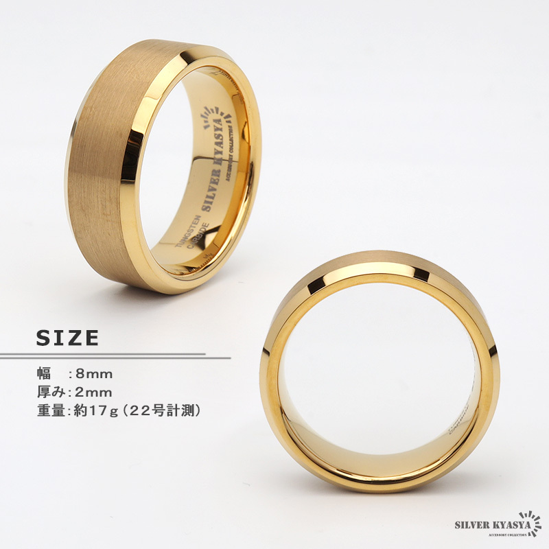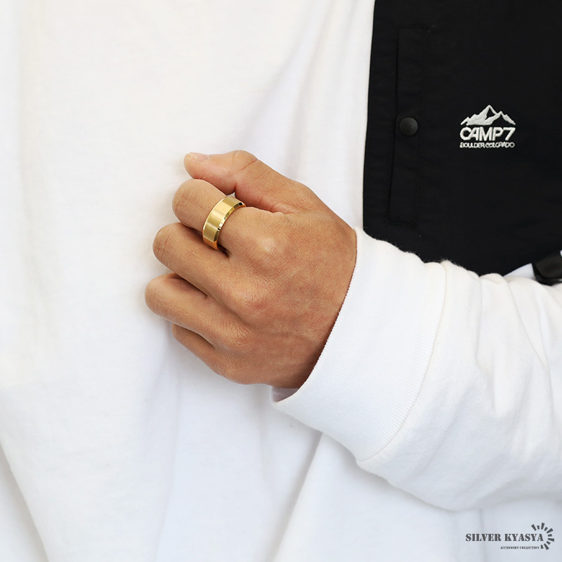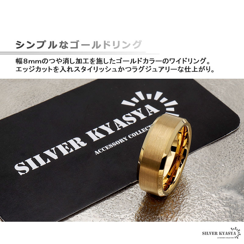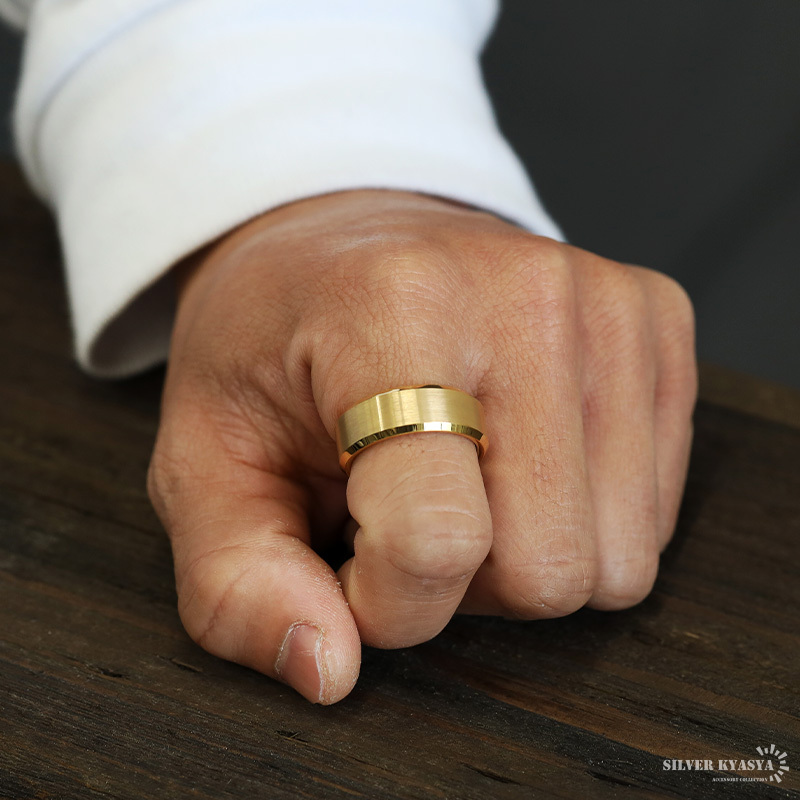 幅8mmのつや消し加工を施したゴールドカラーのワイドリング。エッジカットを入れスタイリッシュかつラグジュアリーな仕上がり。