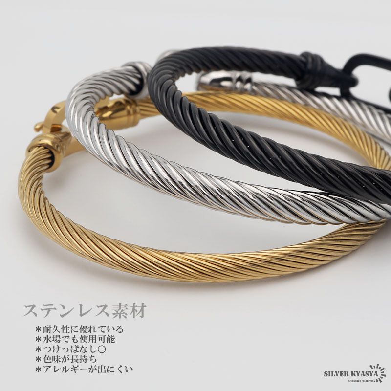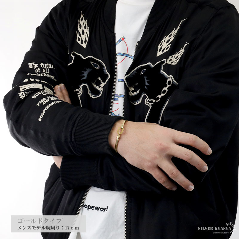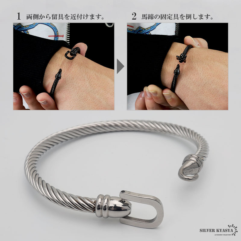 シンプルな馬蹄デザインの留め具と密度のあるワイヤーデザインのバンドを組み合わせたお洒落なブレスレット。ゴールド、シルバー、ブラックの3カラー。