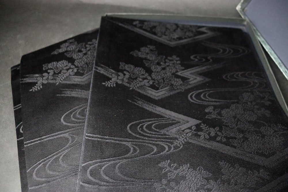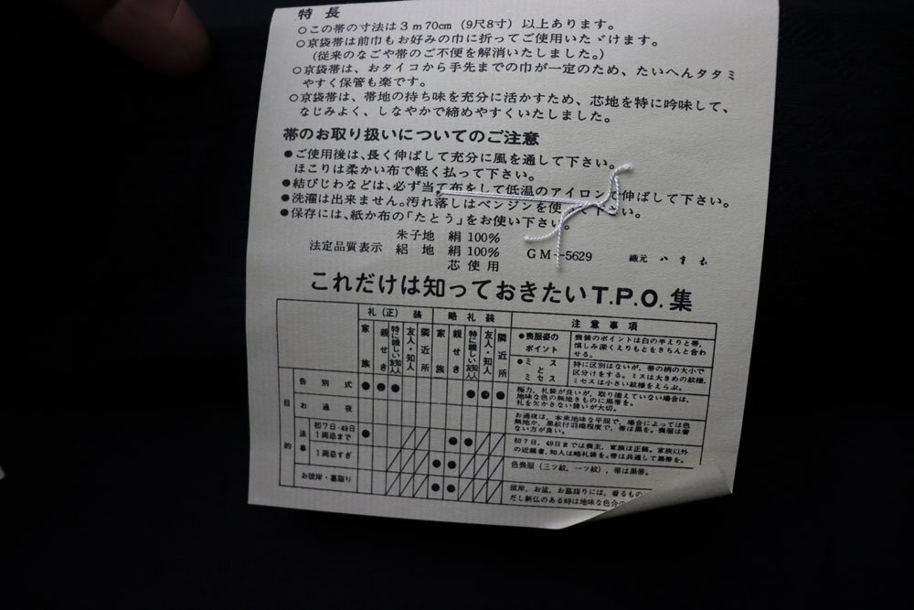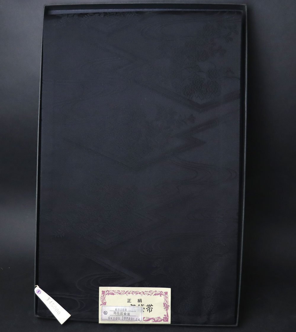 ■W-4330■喪の京袋帯 正絹 尾佐江令亜 ハ重衣 巾一尺/長九尺八寸 未使用品 共箱入り■
