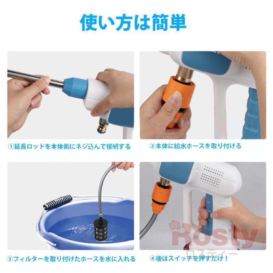 同梱内容:本体*1、24Vバッテリー*2、回転ノズル*1、ステンレス綱延長ロッド*1、充電器*1、ソープボット*1、自吸式フィルター*1、収納ケース*1