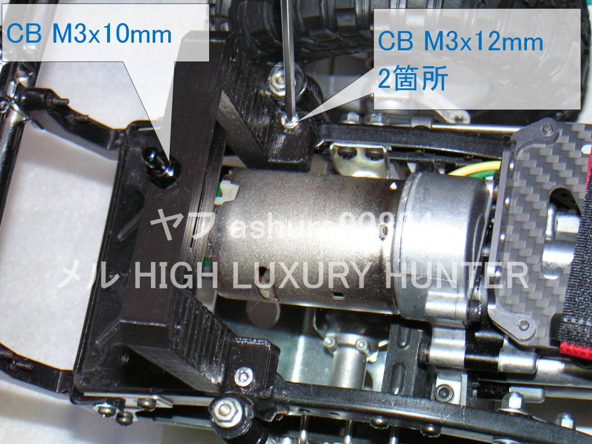 写真の「吹き出し」は使用ネジのサイズです。「赤字」はタミヤのキット付属のもの、「青字」は出品物付属のものを指しています