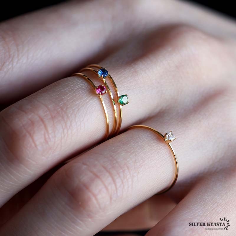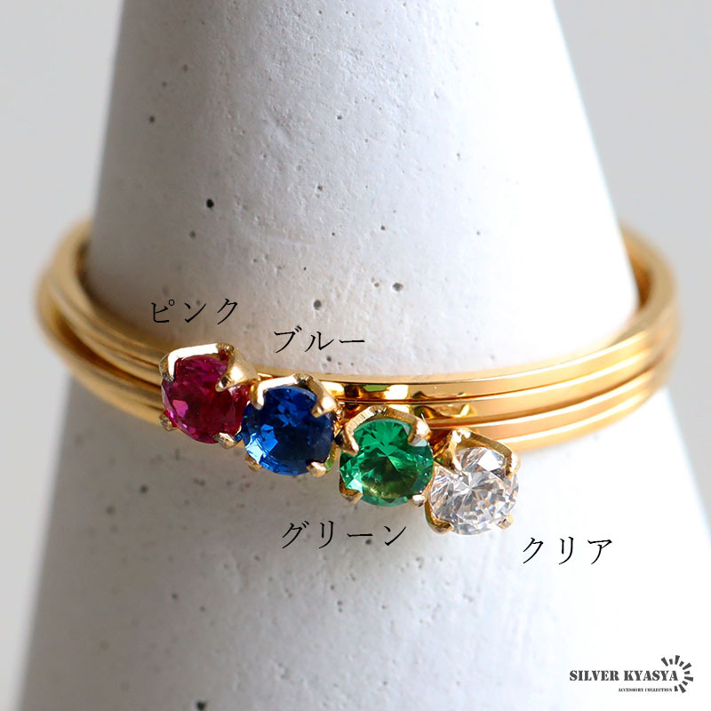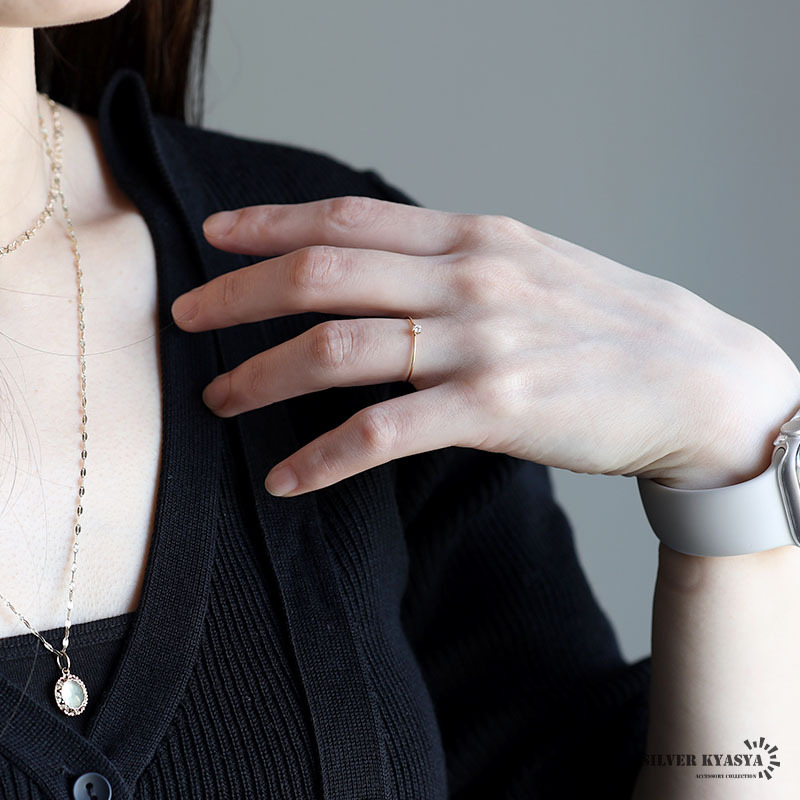 極細のアームに小粒のジルコニアを一粒据えたかわいいリング。華奢なデザインが指元のアクセントにおすすめのアイテムです。4カラーのストーンから選べます。