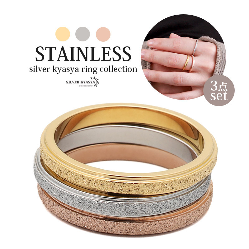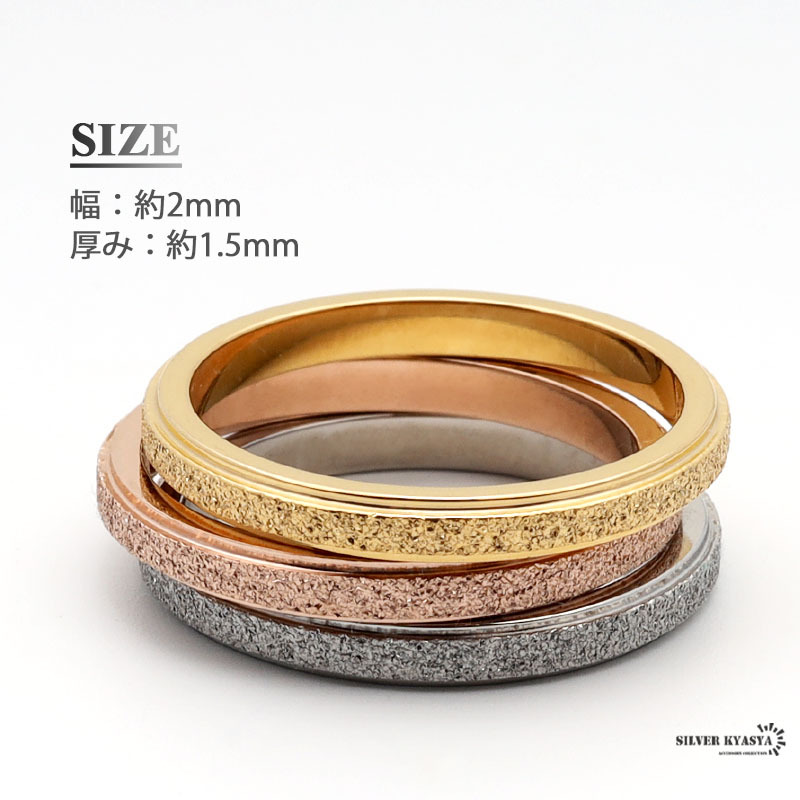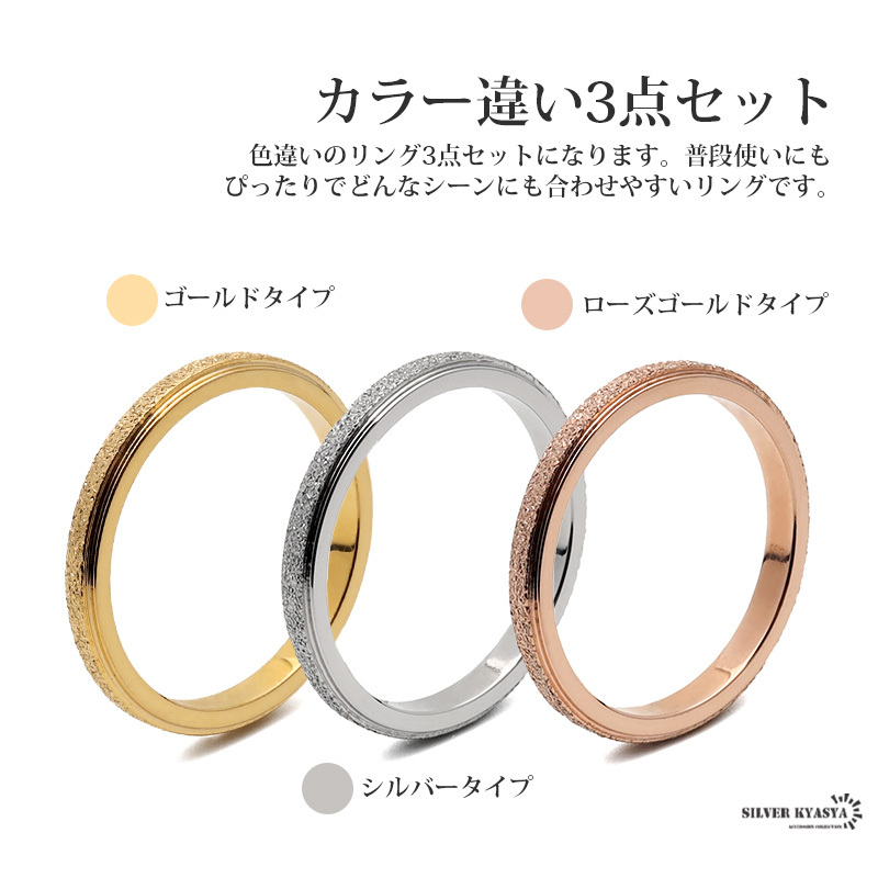 色違い(ゴールド、シルバー、ローズゴールド)のリング3点セットになります。普段使いにもぴったりでどんなシーンにも合わせやすいリングです。