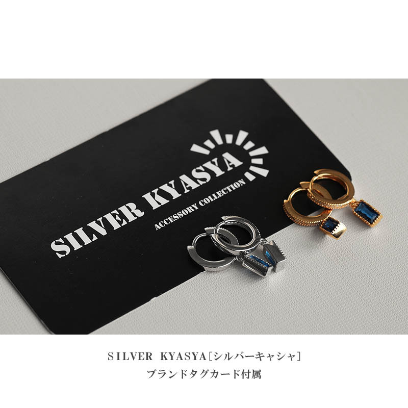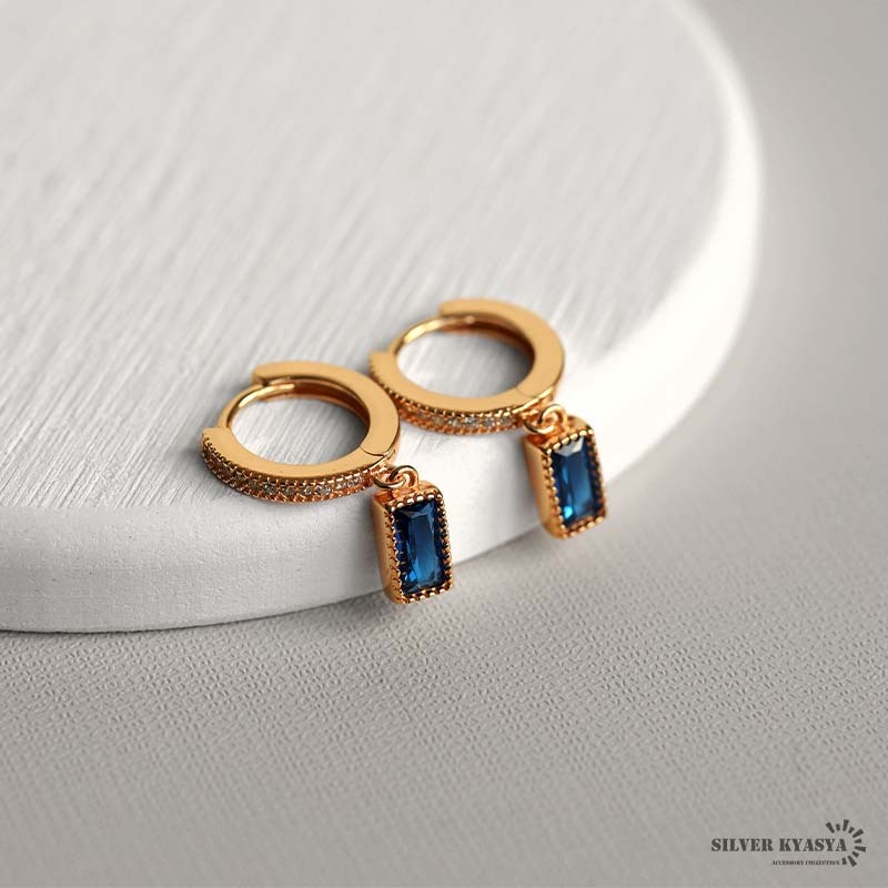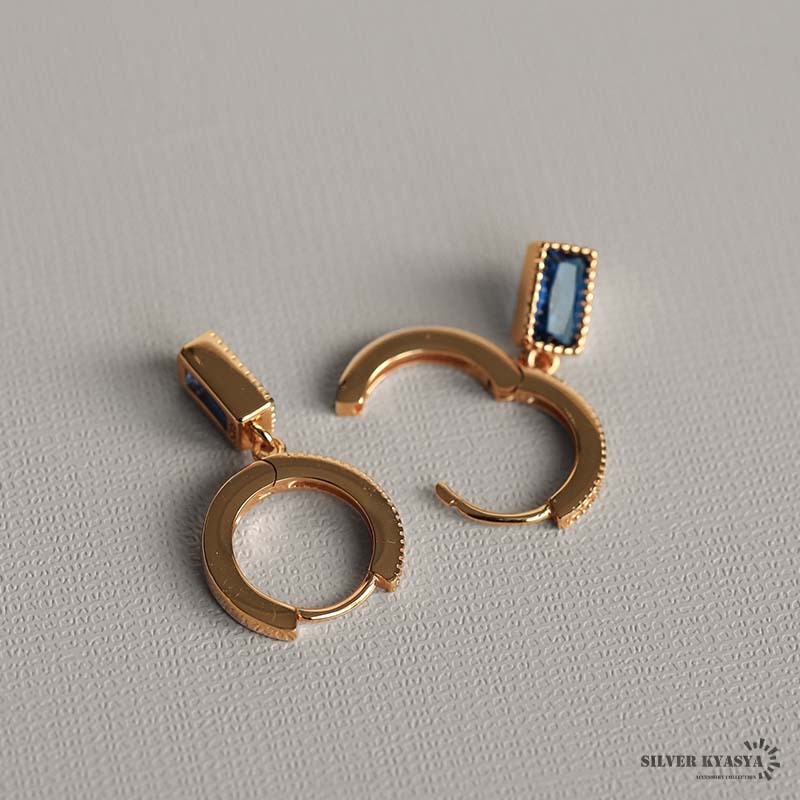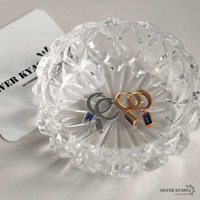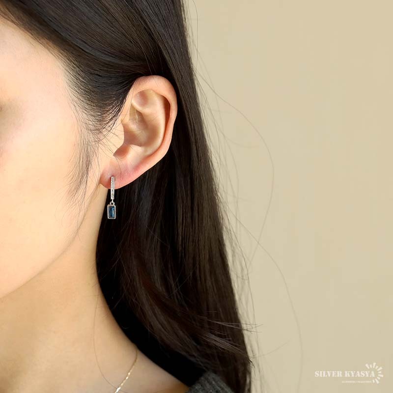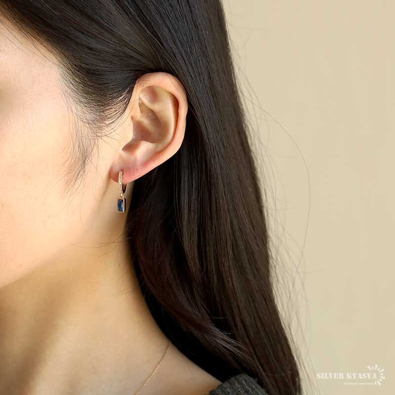スクエア型の青いジルコニアがキラキラ輝くドロップピアス。フープに据えられたビジューも相まって、ラグジュアリーな雰囲気を演出します。上品でありながら、カジュアルなテイストにも合う万能アイテム。