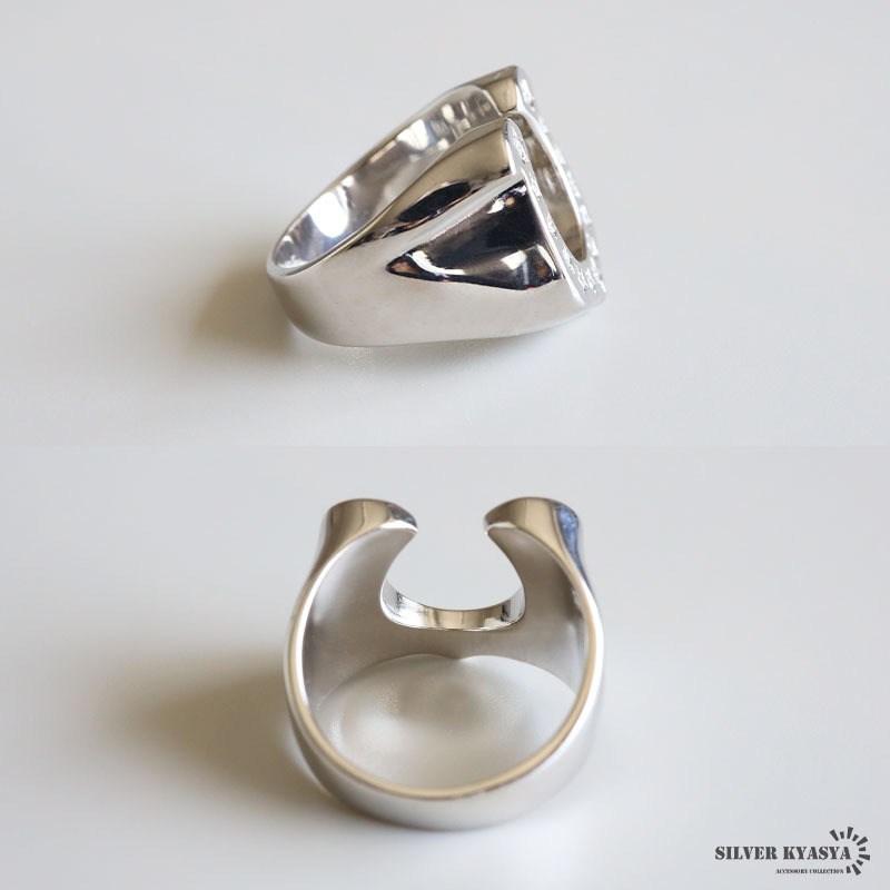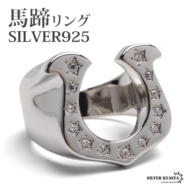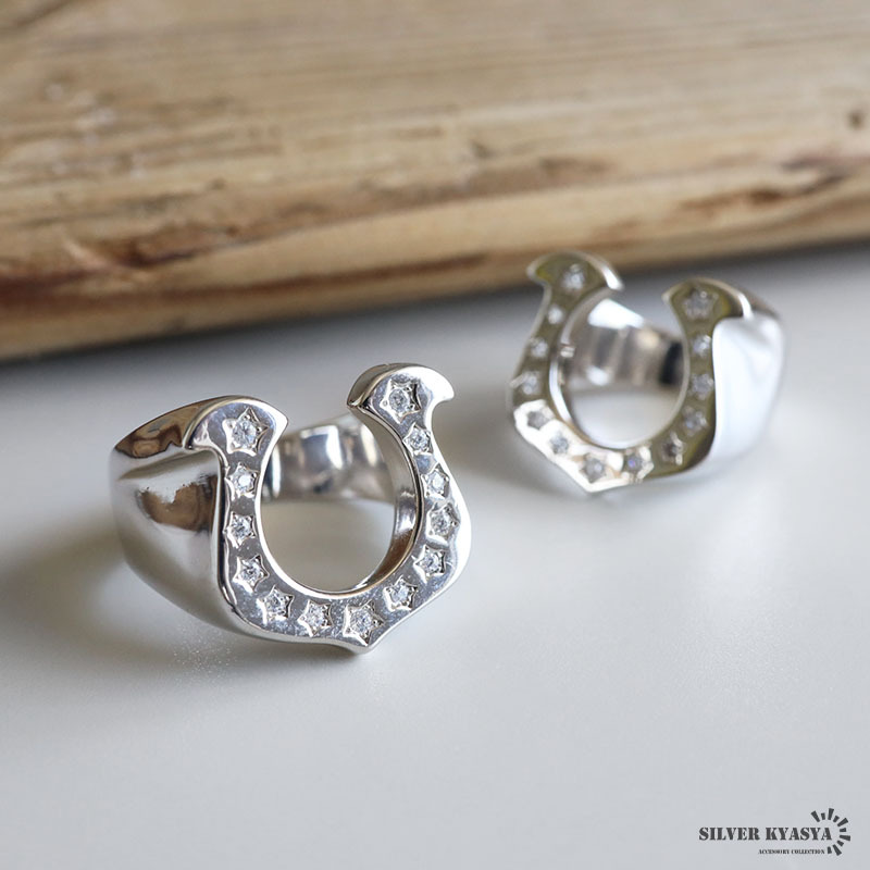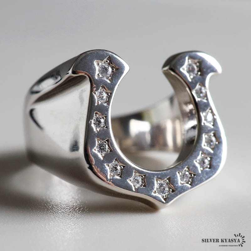 ラッキーアイテムとして知られる馬蹄(馬のひづめ)を模したワイドなリング。表面に施したスターの掘り込みにはキラキラ輝くストーンをセット。ユニークなデザインで指元のアクセントにおすすめです。