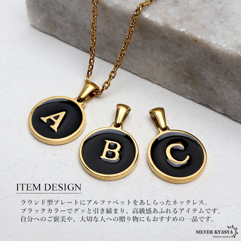 ラウンド型プレートにアルファベットをあしらったネックレス。ブラックカラーでグッと引き締まり、高級感あふれるアイテムです。自分へのご褒美や、大切な人への贈り物にもおすすめの一品です。