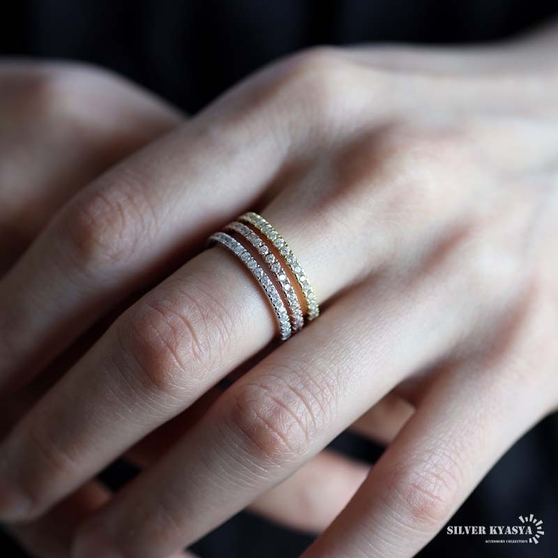 キラキラ煌めくジルコニアが映えるフルエタニティリング。爪留めデザインがジルコニアの存在感を上げ、華やかな印象のアイテムです。ゴールド・シルバー・ローズゴールドの3カラーバリエーション。