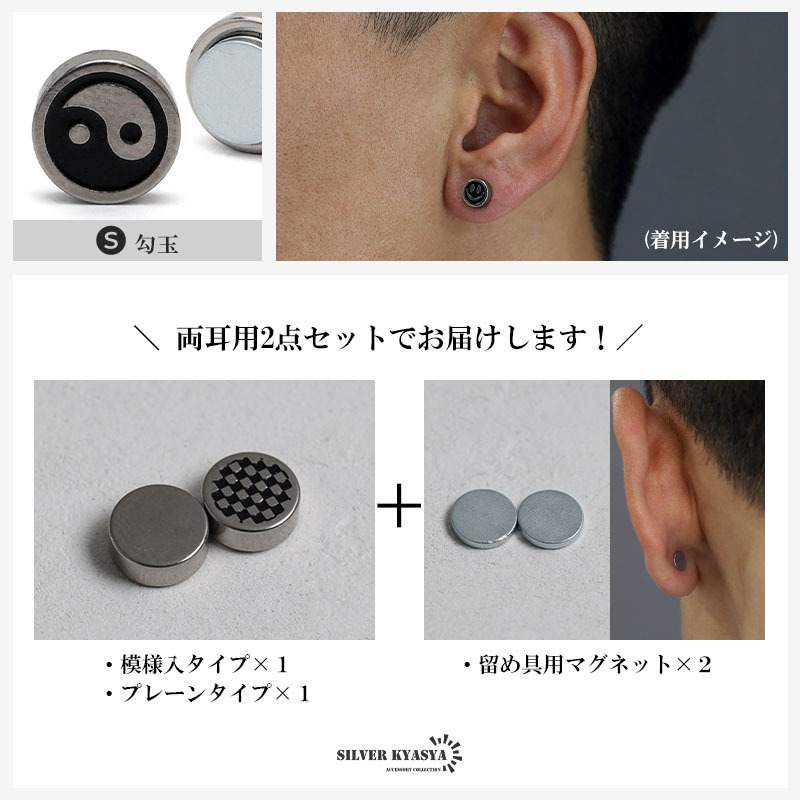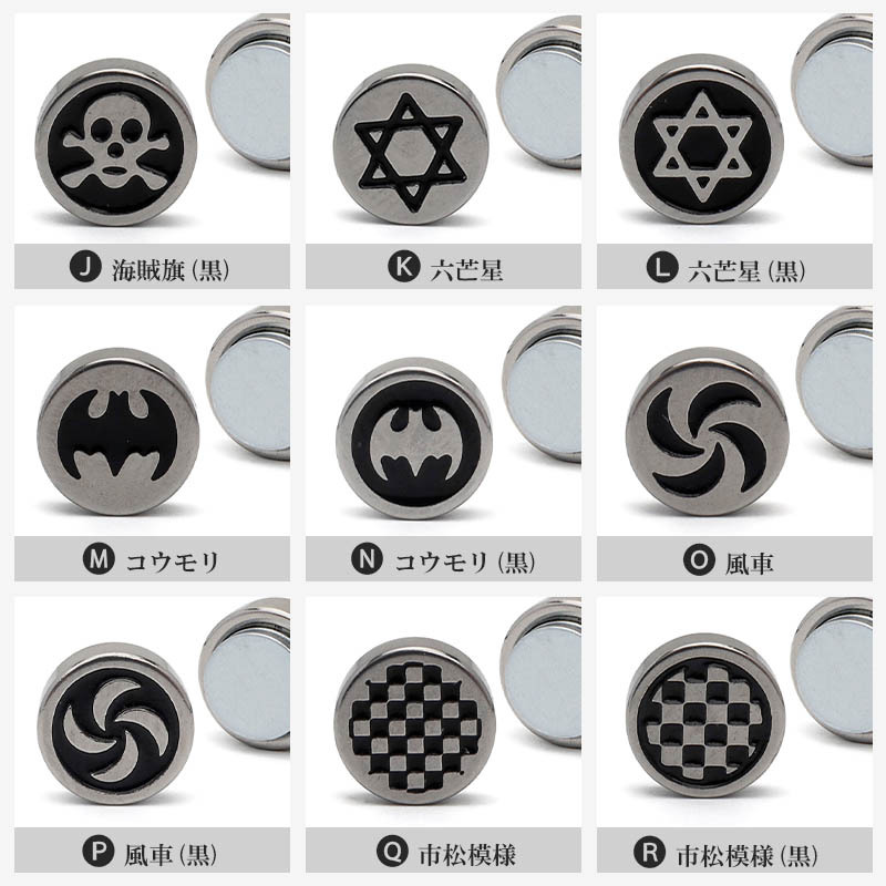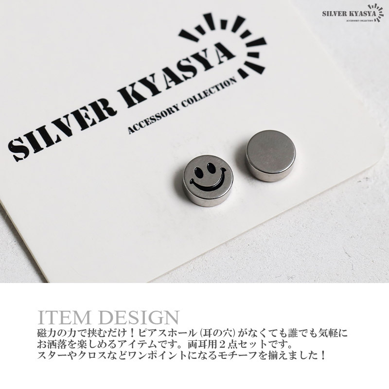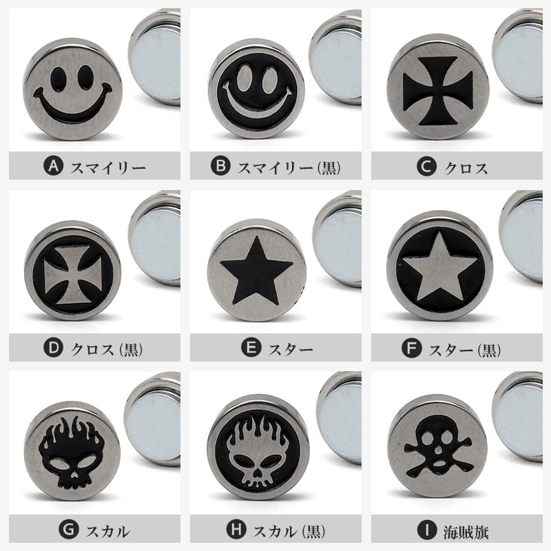 ピアスホールが無くても使えるマグネットピアス。本体と付属のマグネットで耳に挟むだけで装着できます。全19タイプの個性的なワンポイントになるマークを選べます。