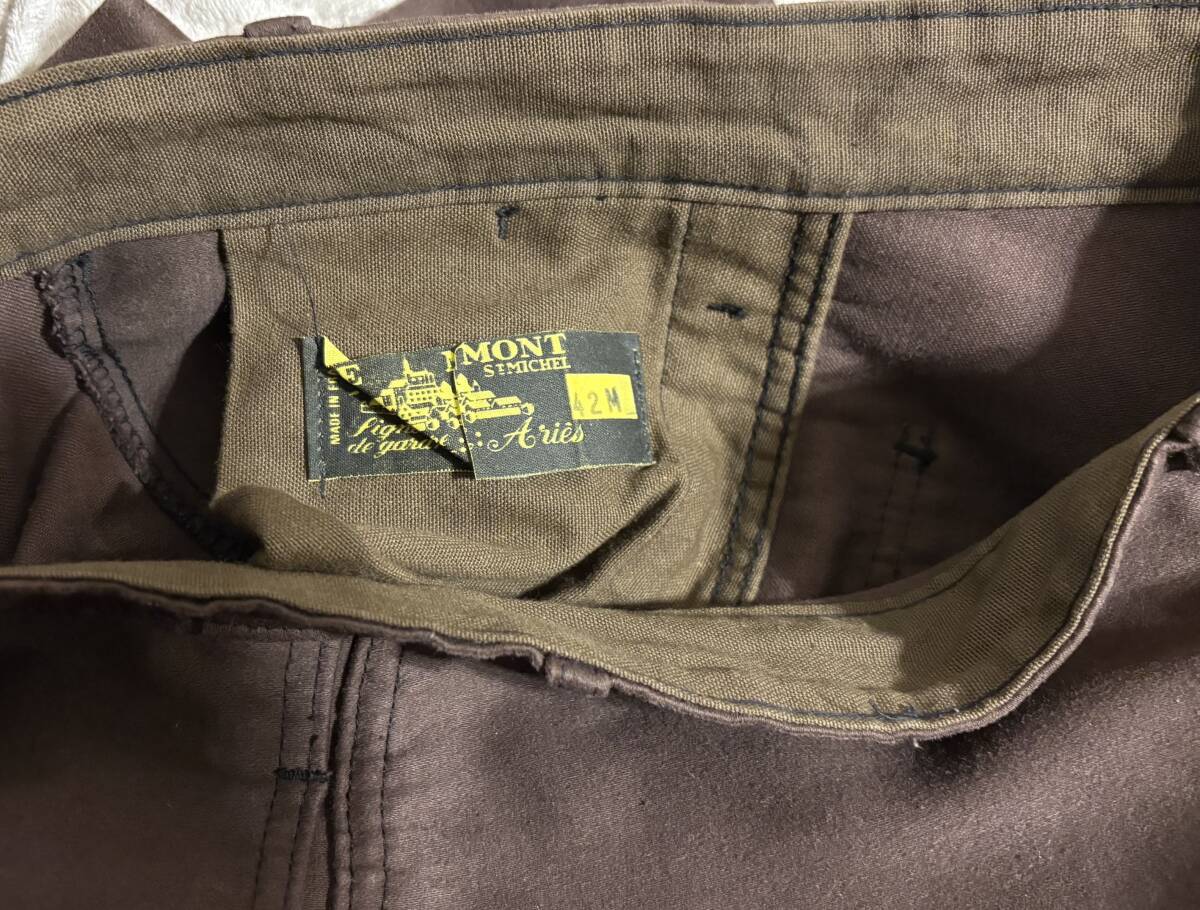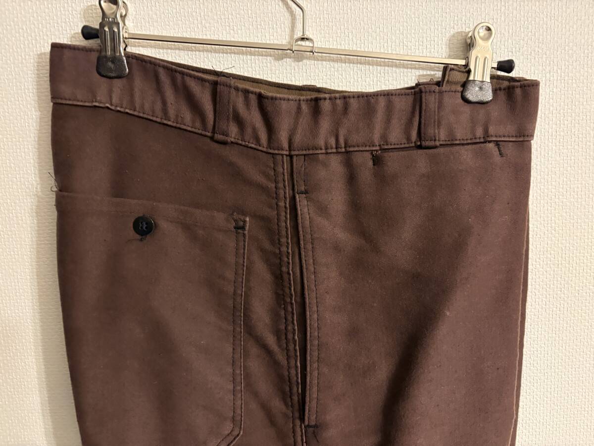 説明:デッドストックのモンサンミッシェルのモールスキンパンツです。金属部分にさびがあります。かなり珍しい茶色です。ワンウォッシュで試着のみの着用です。