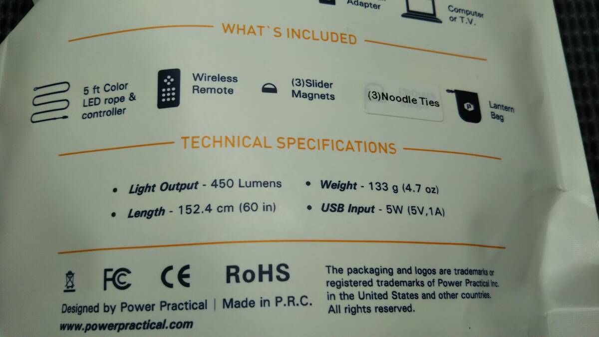 ルミヌードル カラーの特徴 「明るい」「ロープ形状」「USB接続」というLuminoodleの特徴はそのままに、「15色」もの色から好きな光の色を選べます 選べる色数15色 赤、黄、緑、青、紫、白など全部で15色に対応。15色が順番に変わるフェードモードもあります。 ロープ形状で明るい ロープ形状のライトだから、広範囲を明るく照らせます。Luminoodle COLORの長さは1.5m。 USBで手軽に給電 お手持ちのUSBモバイルバッテリー、パソコン、USBポートのあるTVなど様々な電源から給電可能です。 明るさ調節可能 明るさを8段階で調節可能。必要に応じバッテリーの持ちを良くすることができます。 リモコンで操作 手元のビルトインコントローラー、リモコンのいずれでも操作可能。離れた場所から色や明るさを調節できます。 ルミヌードル カラーのこだわり 本当に使えるライトにするための、Power Practical のこだわりです。 スライドマグネット COLOR: 3個付属 スライド式のマグネットです。車、スチール棚などにくっつきます。 ランタンになる COLOR: 1個付属 付属のナイロンバッグに入れるとランタンに 保管・持ち運びにも便利。 クイックタイ COLOR: 3個付属 薄い鉄の板がついているマジックテープ付きのタイです。様々なものにルミヌードルをつるす際に使います。 防水 高純度のシリコンLEDライトをコーティング。 【Luminoodle COLOR】 長さ: 1.5m 明るさ: 450ルーメン 重さ: 133g 付属品:リモコン、クイックタイ3本、マグネット3個、ナイロンバッグ 防水仕様: 防水 給電方法: USB typeA リバーシブル 消費電力: 5W(5V 1A) 点灯時間*: 2時間(最大輝度の場合)~ 10時間(最小輝度の場合) (Lithium 3400バッテリー使用時) リモコン電池:CR2025ボタン型電池 * 大容量バッテリー等を使用し、より長い時間連続点灯させることも可能です。 【使用上のご注意】 Luminoodleは、シリコンチューブの内部にテープ式ライトが入っています。USBケーブル部分とテープ式ライトの接続部分を強く引っ張ると断線等が発生し、ライトが点灯しなくなる恐れがございます。接続部分には継続的に強い負荷をかけないようご注意下さい。 【よくあるご質問】 Q1. Luminoodleは、どんなUSBバッテリーでも使えるのですか? A. 一般的なUSBバッテリーでお使いになれます。 ※LuminoodleはUSB TypeAの端子を使用しておりますが、端子部分がリバーシブル(どちら側からさしても使用できる)対応となっております。このため、一部のUSBバッテリーでは、「点灯しない」「差込口の幅が合わず差し込めない」場合がある事を確認しております。 その場合、以下のように延長ケーブルを挟むことでご使用いただける場合があります。 Q2. USBバッテリーのほかに、電源を取ることができる機器はありますか? A. パソコン、テレビなどUSBポートを持っている電子機器に接続することにより給電いただけます。USB-ACアダプターを使うことにより、コンセントに接続して給電することも可能です。