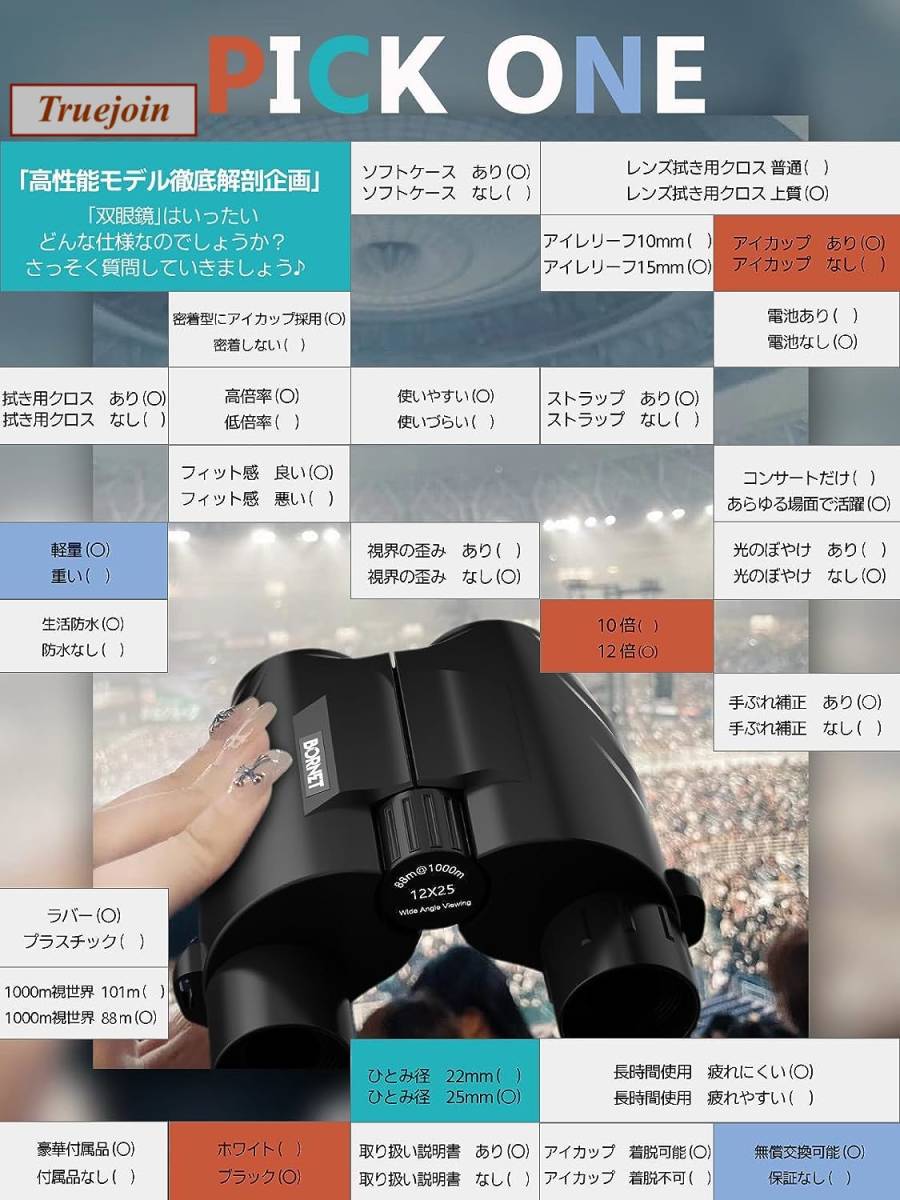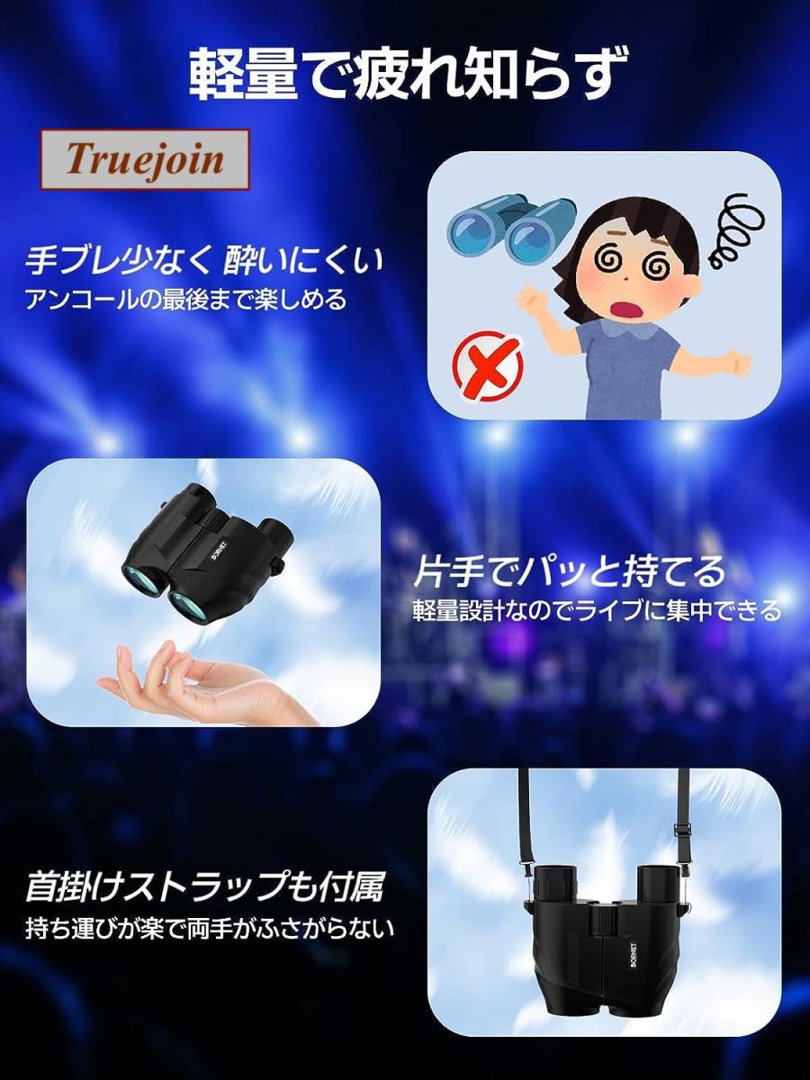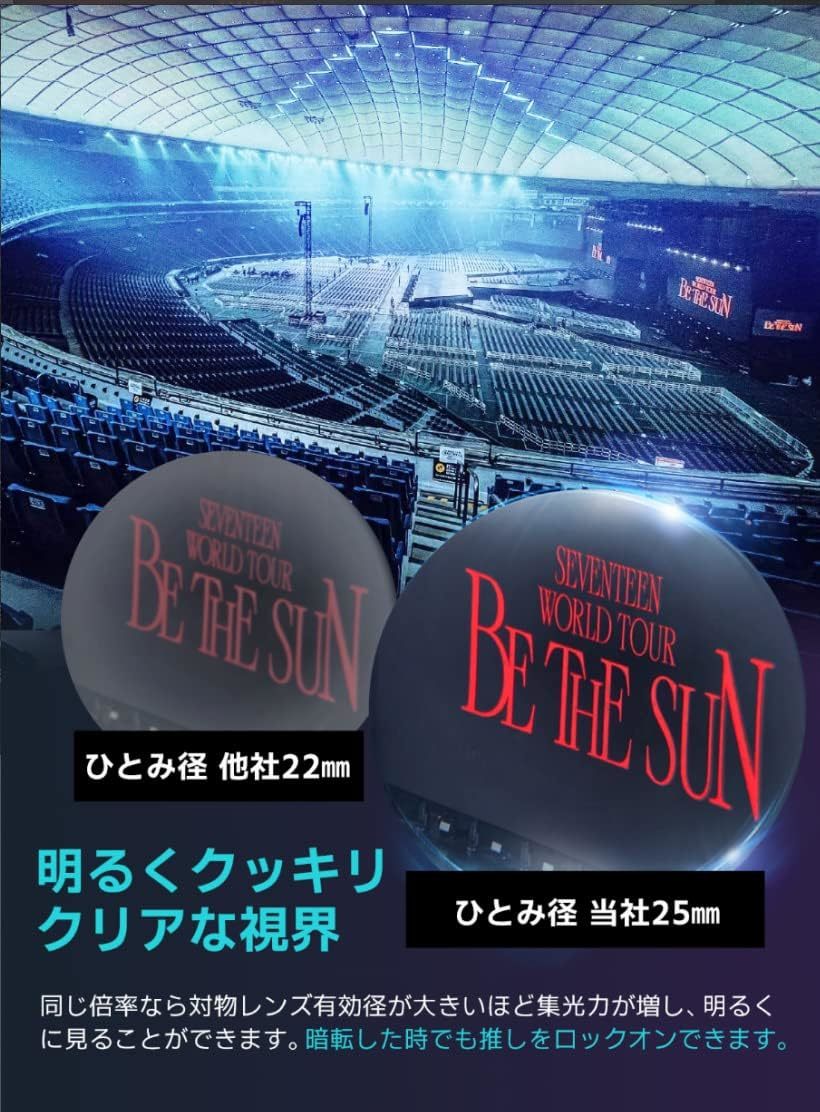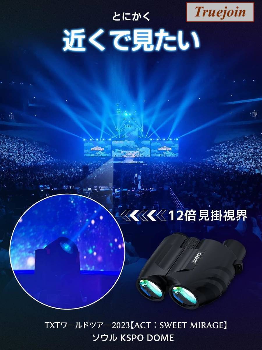 アリーナやドームなどの大きい会場で手持ちの双眼鏡で手ブレを気にせず見られる12倍率です。