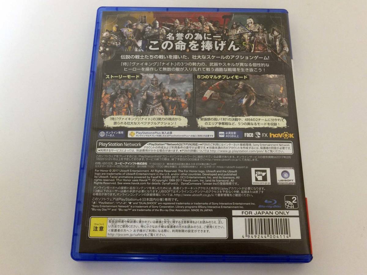 PS4ソフト FOR HONER フォーオナーを出品いたします。 壮大な斬撃型スペクタクルアクション!ナイト、ヴァイキング、侍、それぞれのストーリー。4対4のチームバトルの他、1対1の決闘など多彩なプレイモード。 公式トレーラー ぜひこの機会に購入のご検討をよろしくお願いいたします。 | |||||
