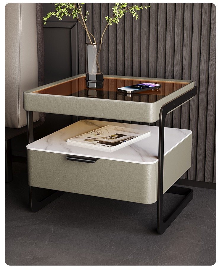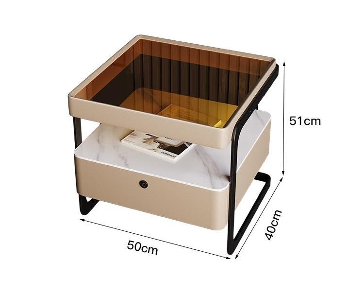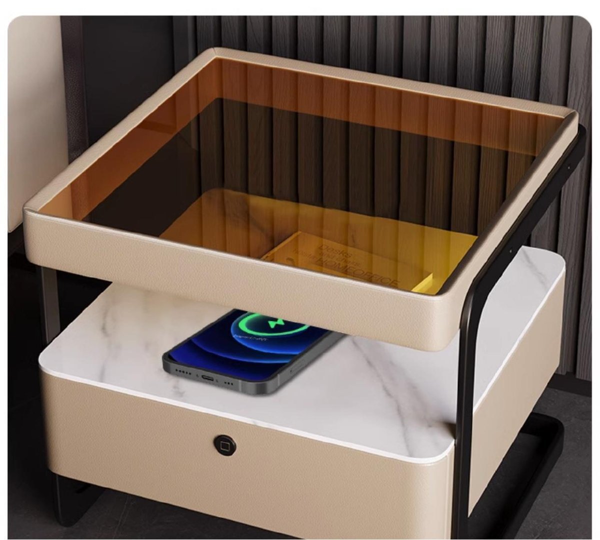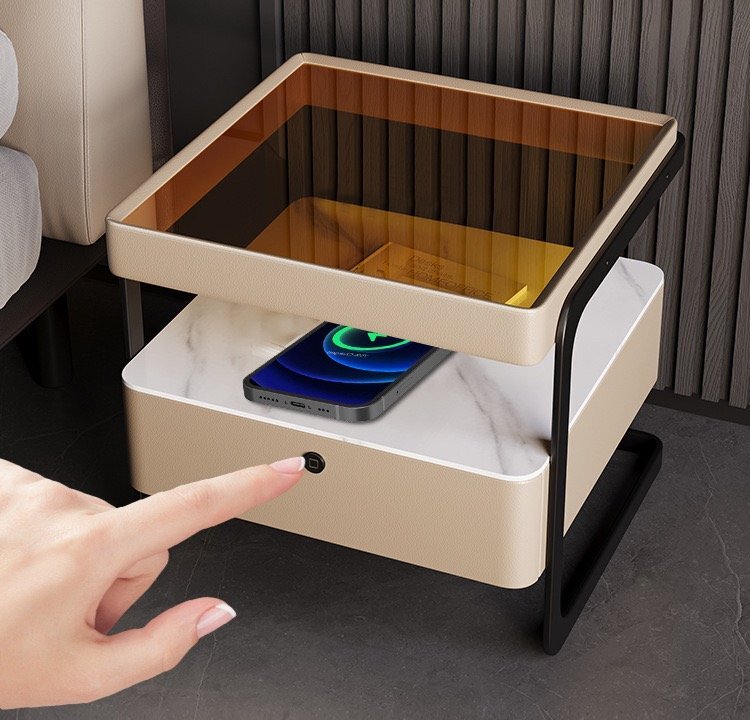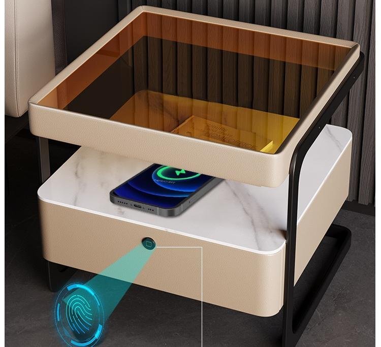 強化ガラストップのスマートナイトスタンド、引き出し付きベッドサイドテーブル、指紋ロック付きミニマリストナイトスタンド、メタルフレーム付き収納キャビネット、無垢材ベッドサイドキャビネット。(ミディアムg