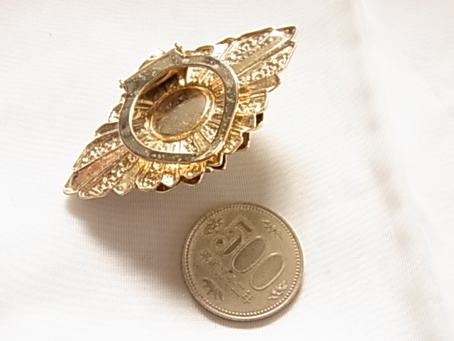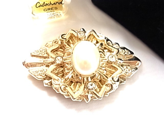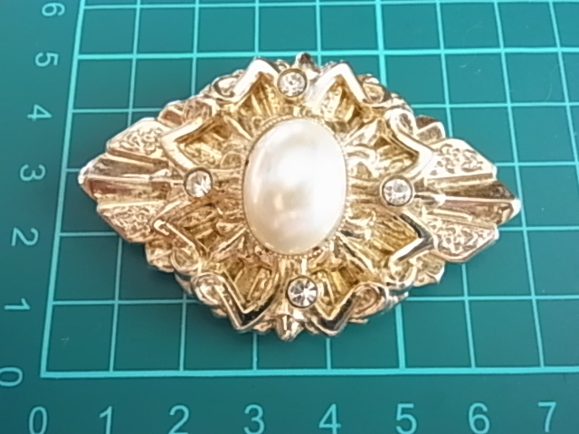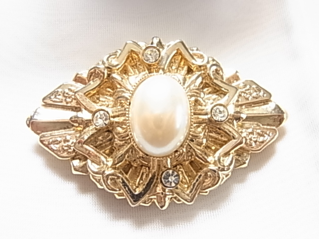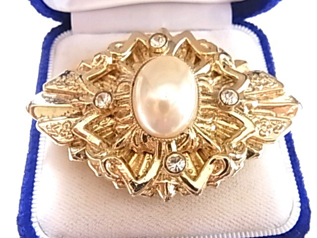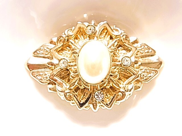 ビンテージ/ヴィンテージ大き目インパクト fakeパール調のストーン調にクリアラインストーンが輝くデザイン キラキラ系 スカーフ留め▲