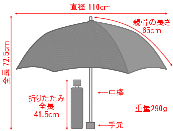 | 8本の丈夫なグラスファイバー骨(先骨はスチール)が支える傘の直径は110cm。 | |