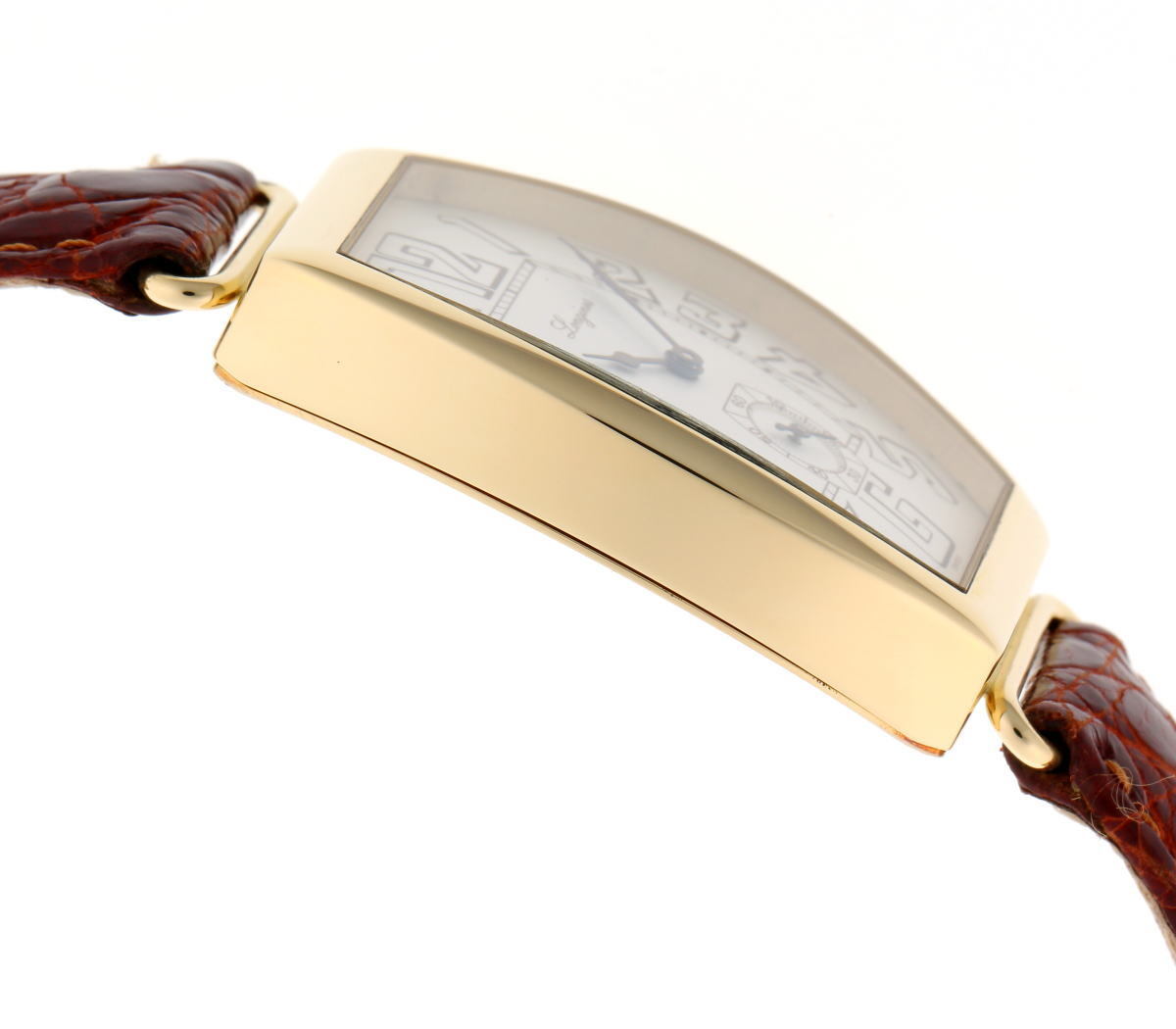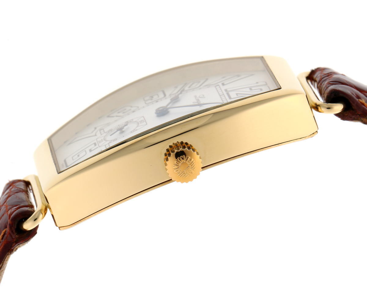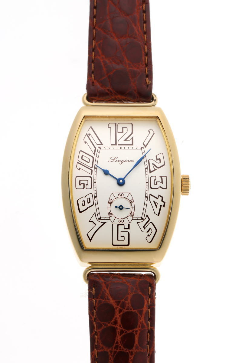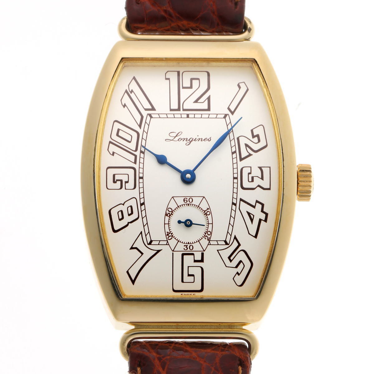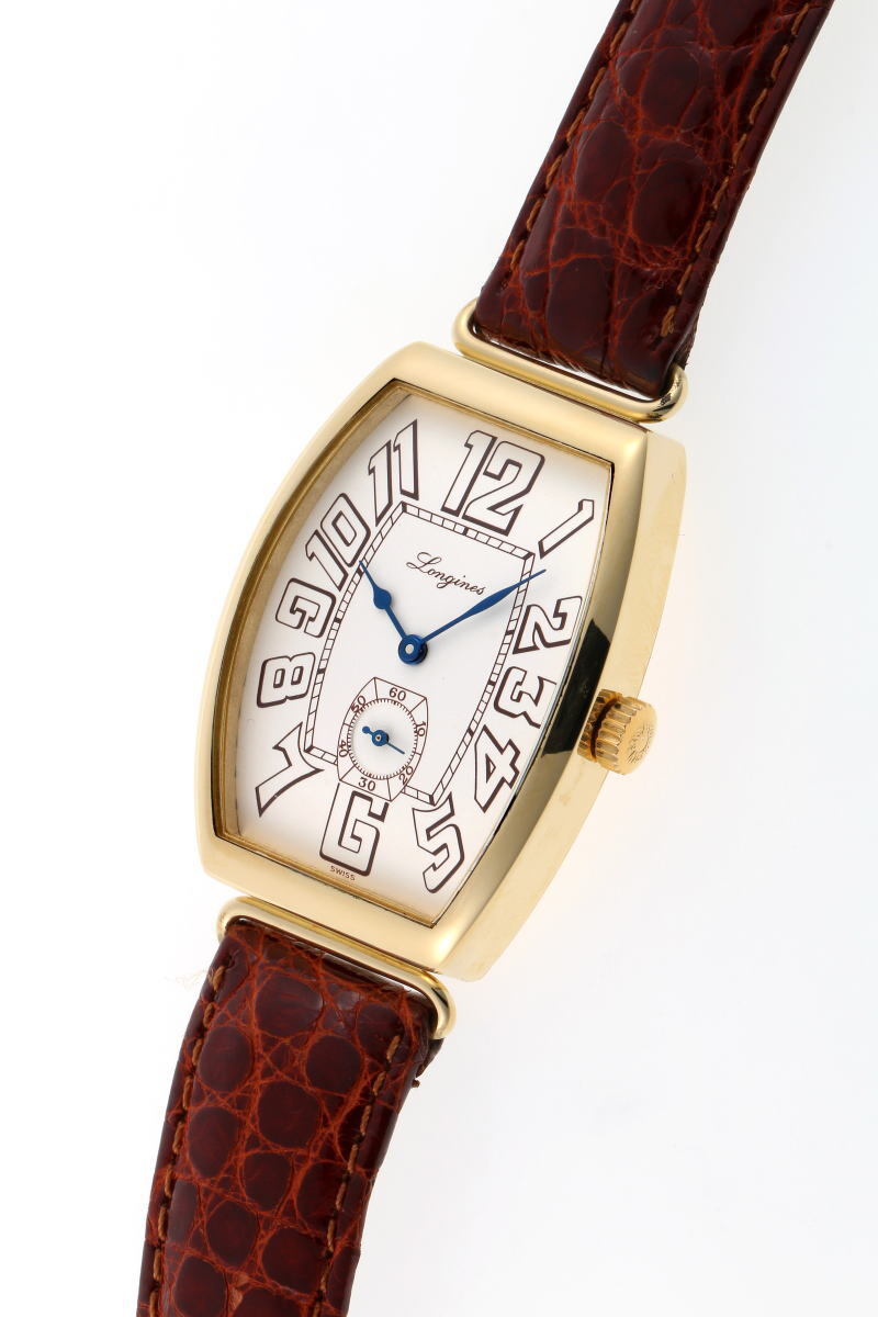 目立つダメージはありません。提携工房にてオーバーホール、磨き済み。-ロンジンの機械式トノーウォッチ。アラビアダイアル。イエローゴールド。