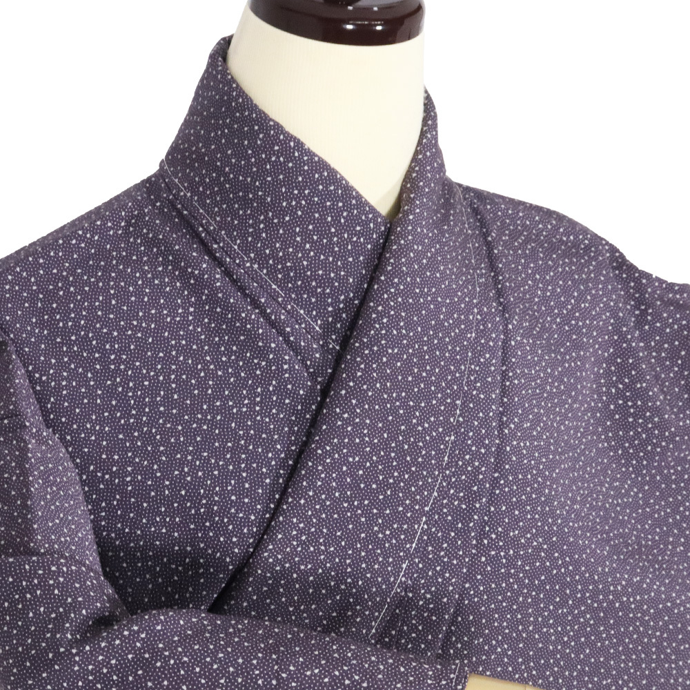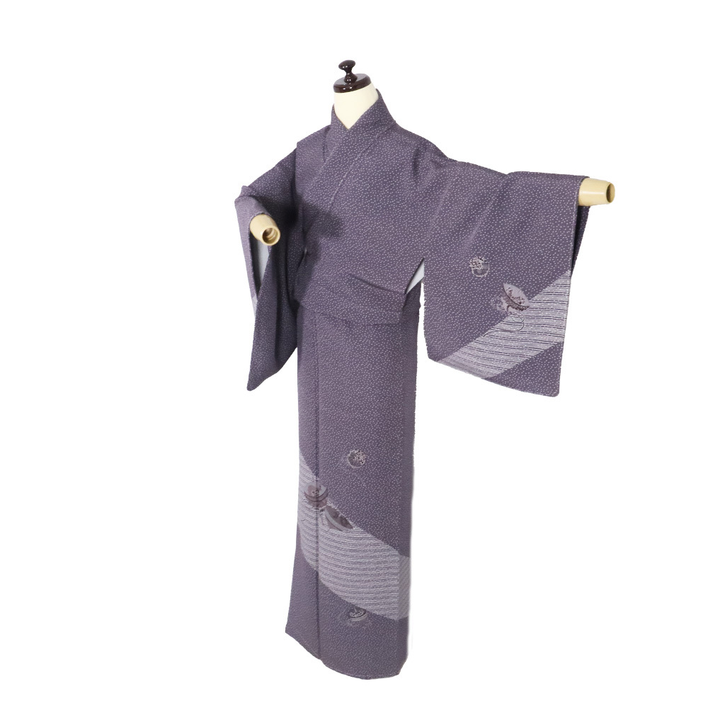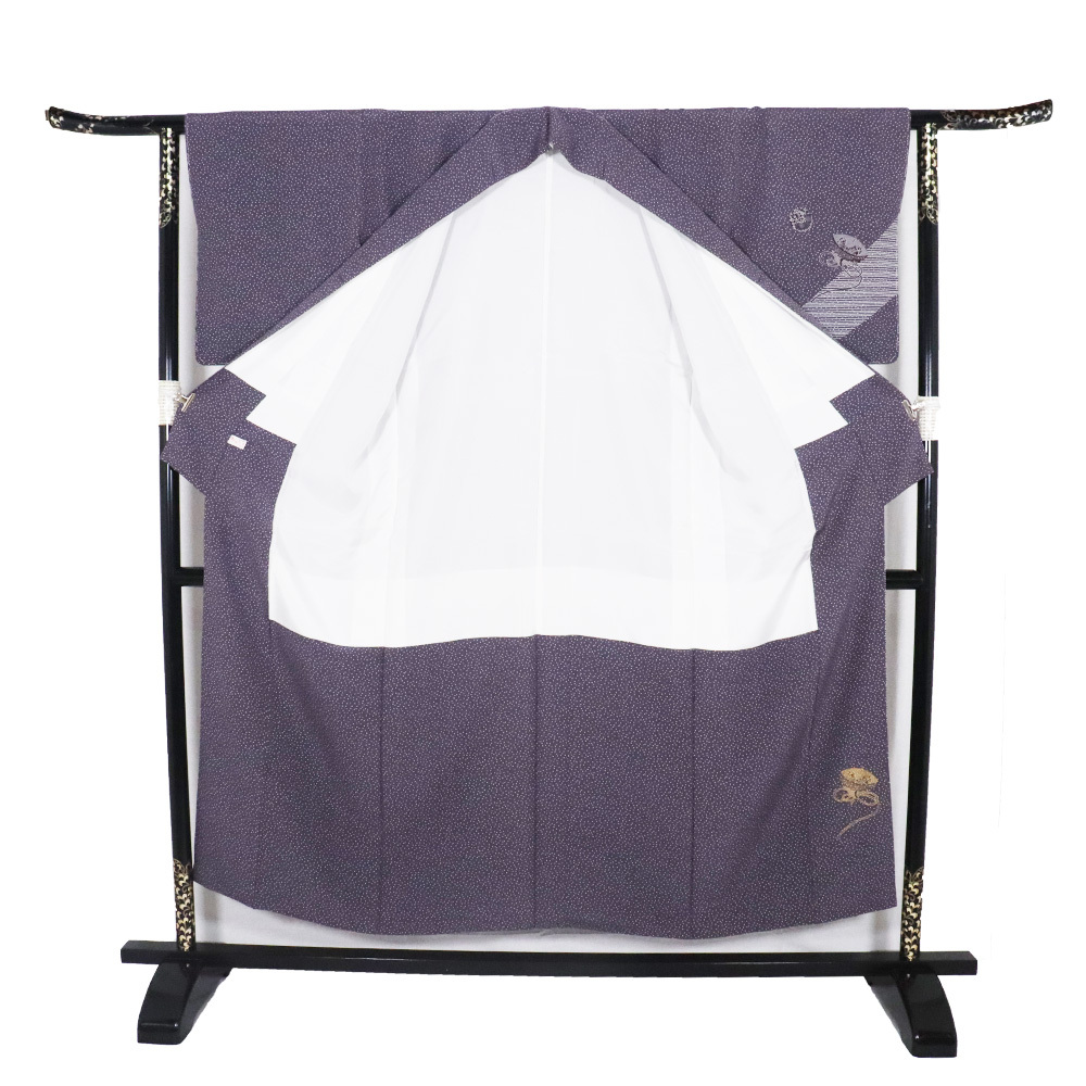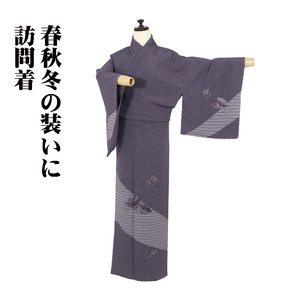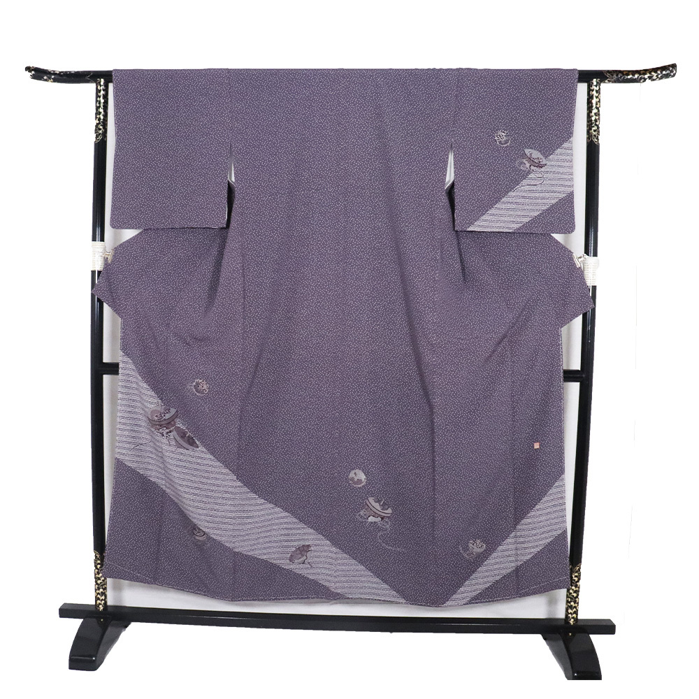| 訪問着 袷 丹後縮緬地 紫(葡萄鼠色)地 独楽・小花びら 158 広襟 作家落款入り 未使用品 仕付け付き | |