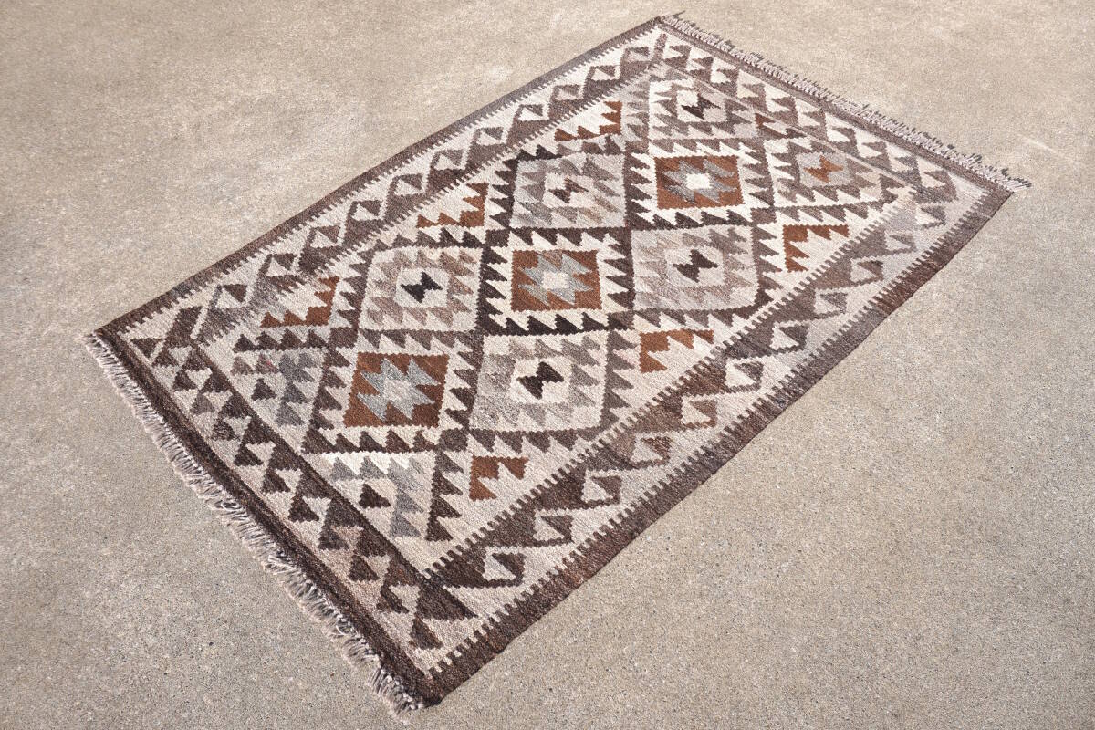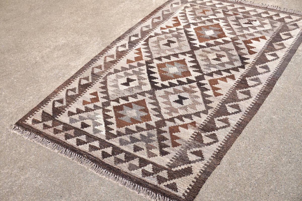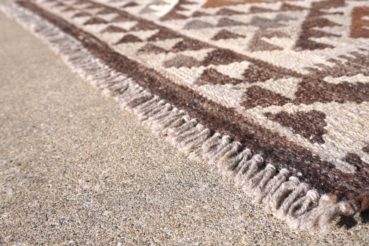 ナチュラルなブラウン系のアースカラーでまとまった、アフガンキリム。