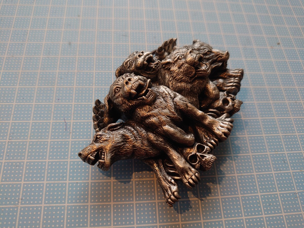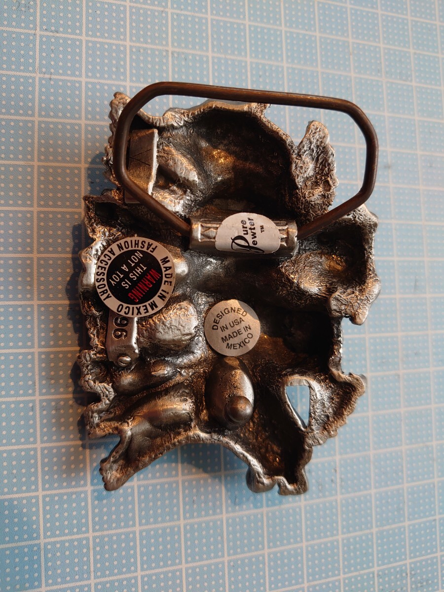 素晴らしいベルトバックルです。未使用品でがかなり古いものでそれなりの小傷などがございます。色は写真が実物と異なって見える場合もあるようです。こちらは銀色系のベースです。画像は前回出品分のものを使用する場合もあり風合いや裏のシール類やその有無などは一つ一つ異なります。苦情返品なしでお願いいたします。ベルト巾45ミリくらいまでです。151gほど。