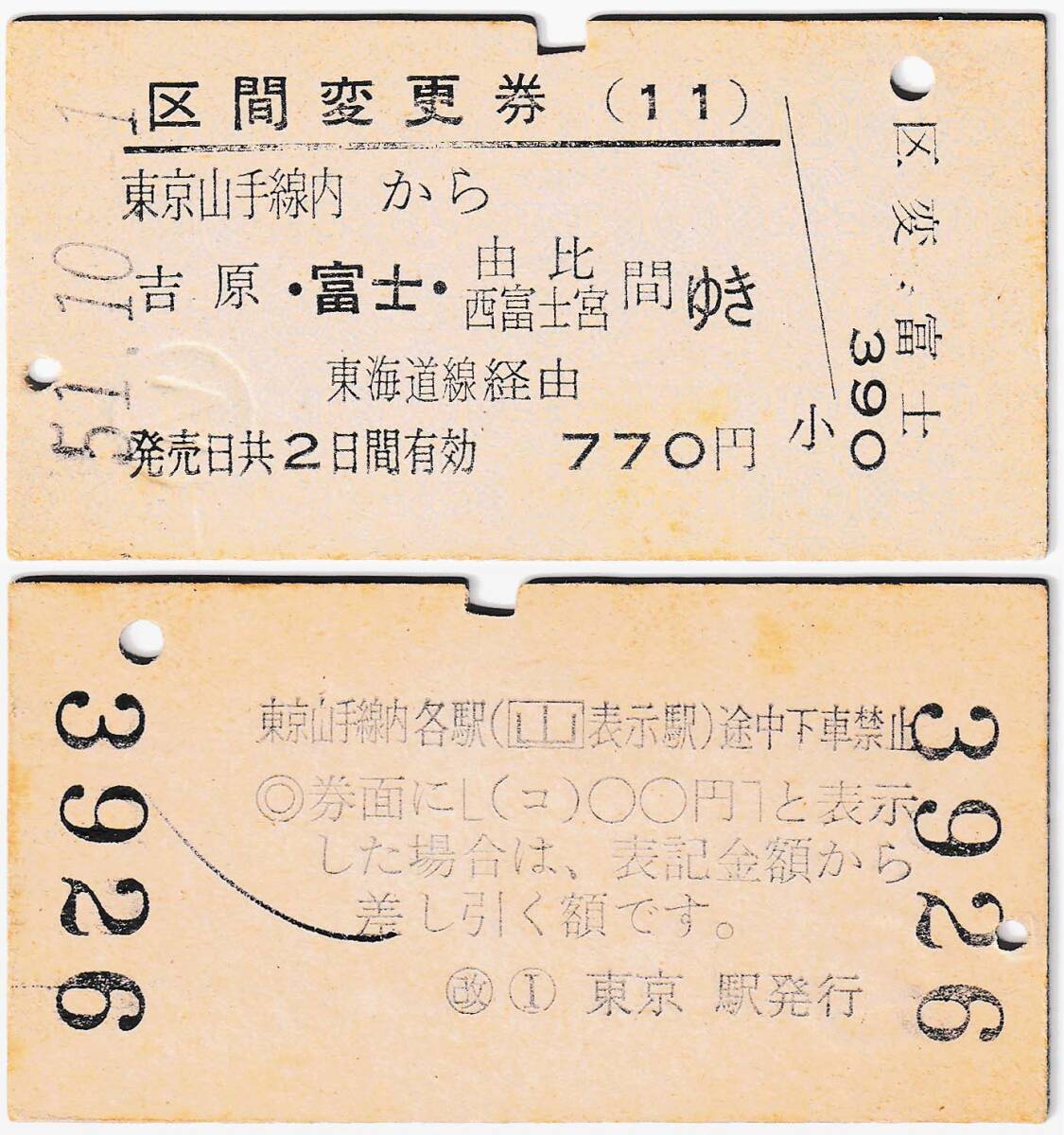 区間変更券(11) 昭和51年 東京山手線内 → 吉原・富士・由比・西富士宮間ゆき