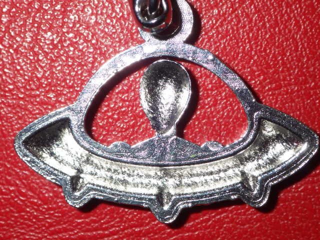 メタル素材、サイズはトップのUFO部分の大きさで3.1cm×2.3cm×0.3cm、チェーンを含めた全長8.4cmくらいです、お好みでチェーンを変えてペンダントなんかにしても良さそうです♪