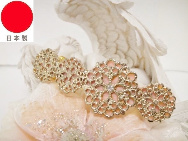バレッタ本体、クリップ等にメッキ加工が施されておりますが経年劣化による色の変色が生じる場合がございます。