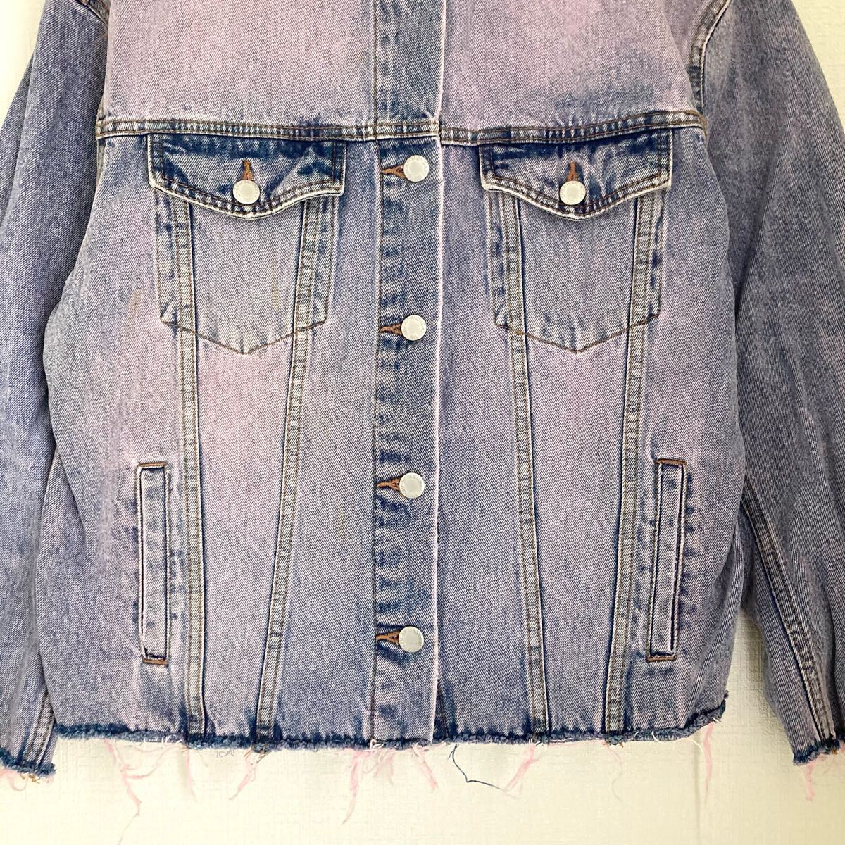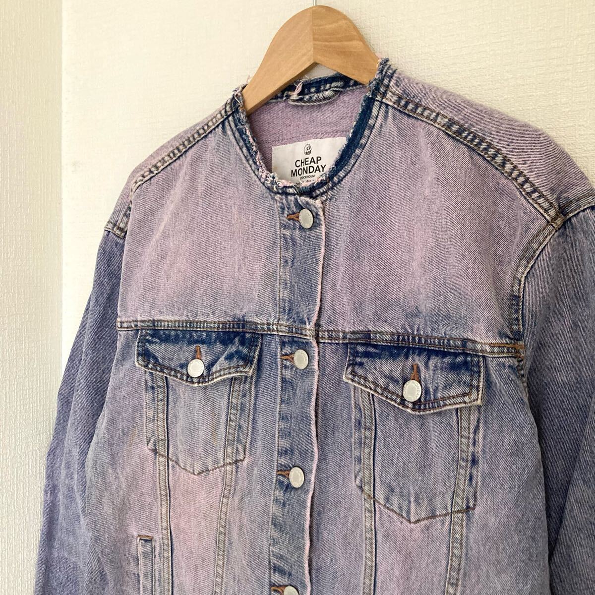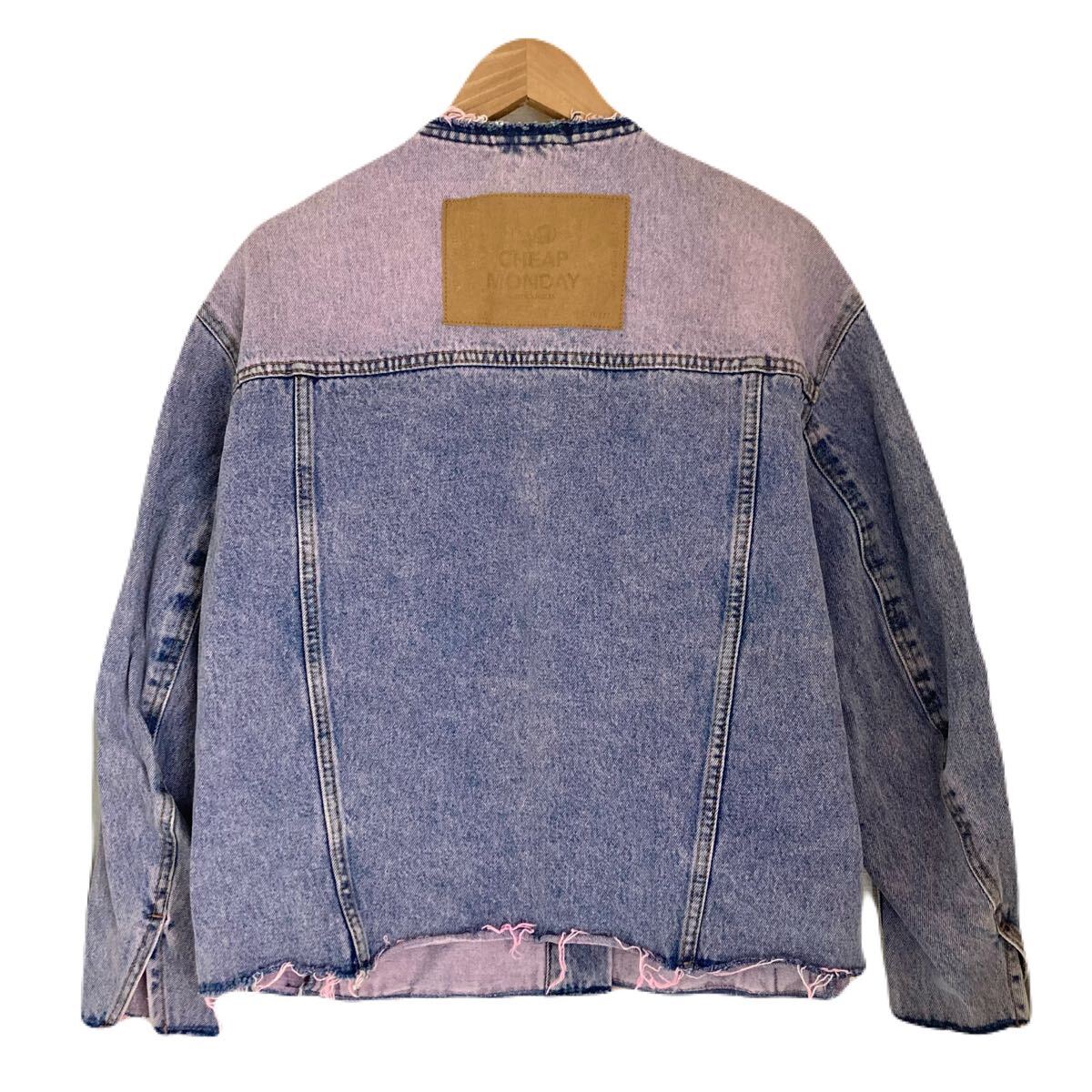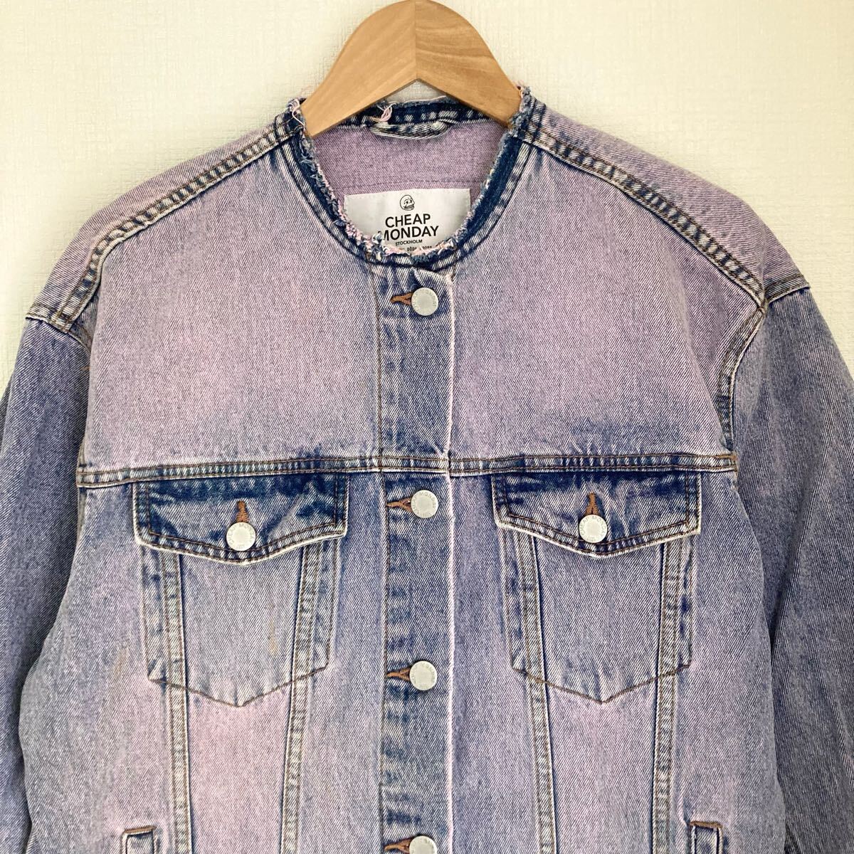 チープマンデー デニムジャケット ダメージ パープル 切りっぱなし フェード 紙パッチ ヴィンテージ感 ユニセックス Y2K