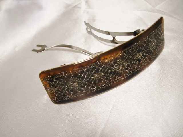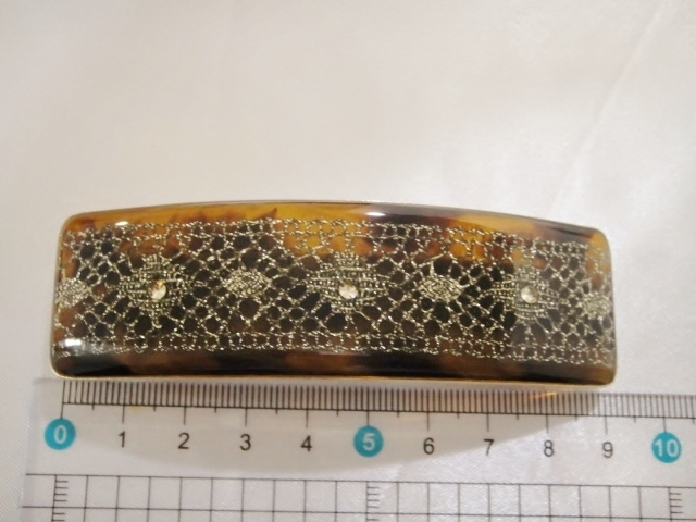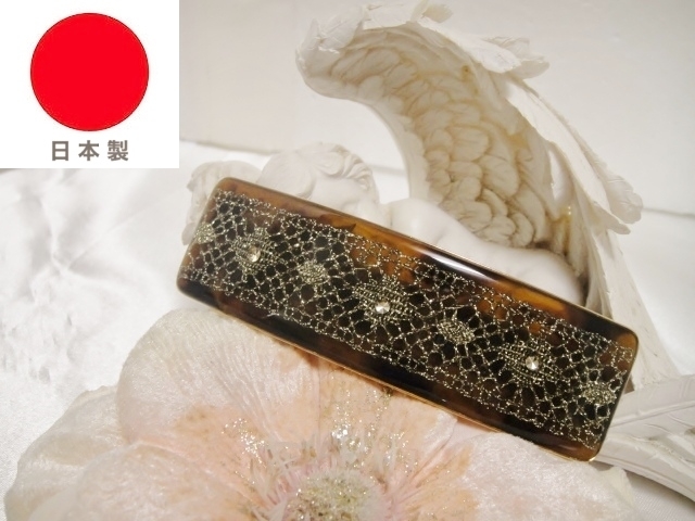 ♪ 新品 バレッタ 日本製『高品質/ロングサイズ/レクタングル/グロスエポ/GOLDレース/スワロフスキー/ブラウン/茶』♪