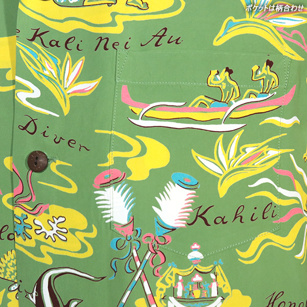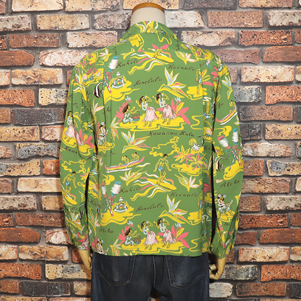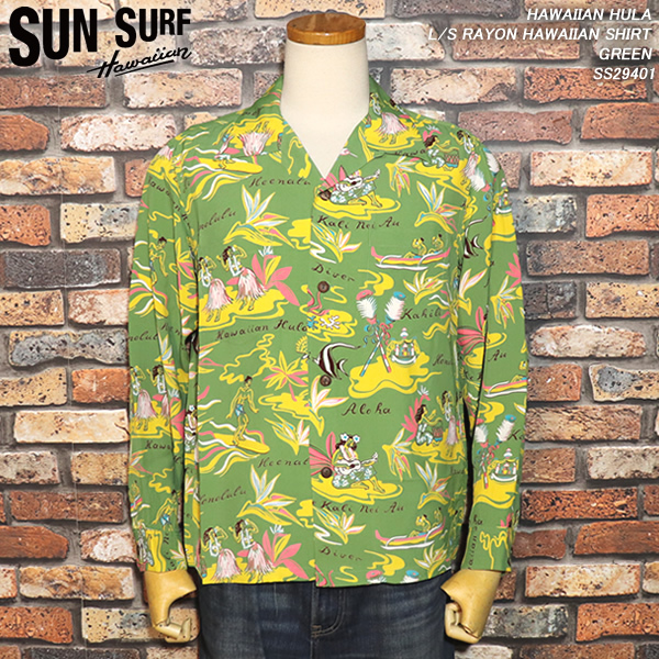 GREEN【M】SUN SURF サンサーフ  HAWAIIAN HULA ハワイアン・フラ 長袖ハワイアンシャツ アロハシャツ SS29401 東洋エンタープライズ