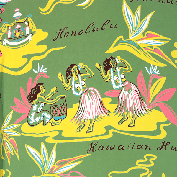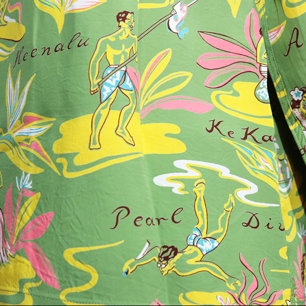 1970年代に誕生し、創業から資料として収集し続けた数千着にも及ぶヴィンテージのアロハシャツを分析。 「アートを着る」と言ってもいいほどプリントのデザインが主役となるアロハシャツにおいて、最大の特徴である鮮やかな発色と深みのある色合いを表現するため、抜染(ばっせん)やオーバープリントといった当時の捺染手法を再現。
