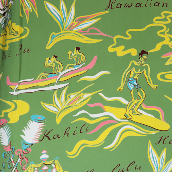 ★フラ、ダイビング、サーフィンなど、ハワイのアクティビティーは当時からアロハシャツのモチーフとしても人気が高かった。