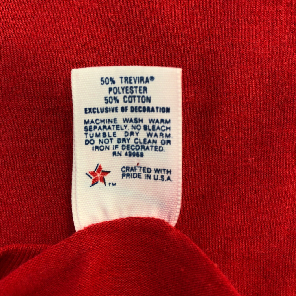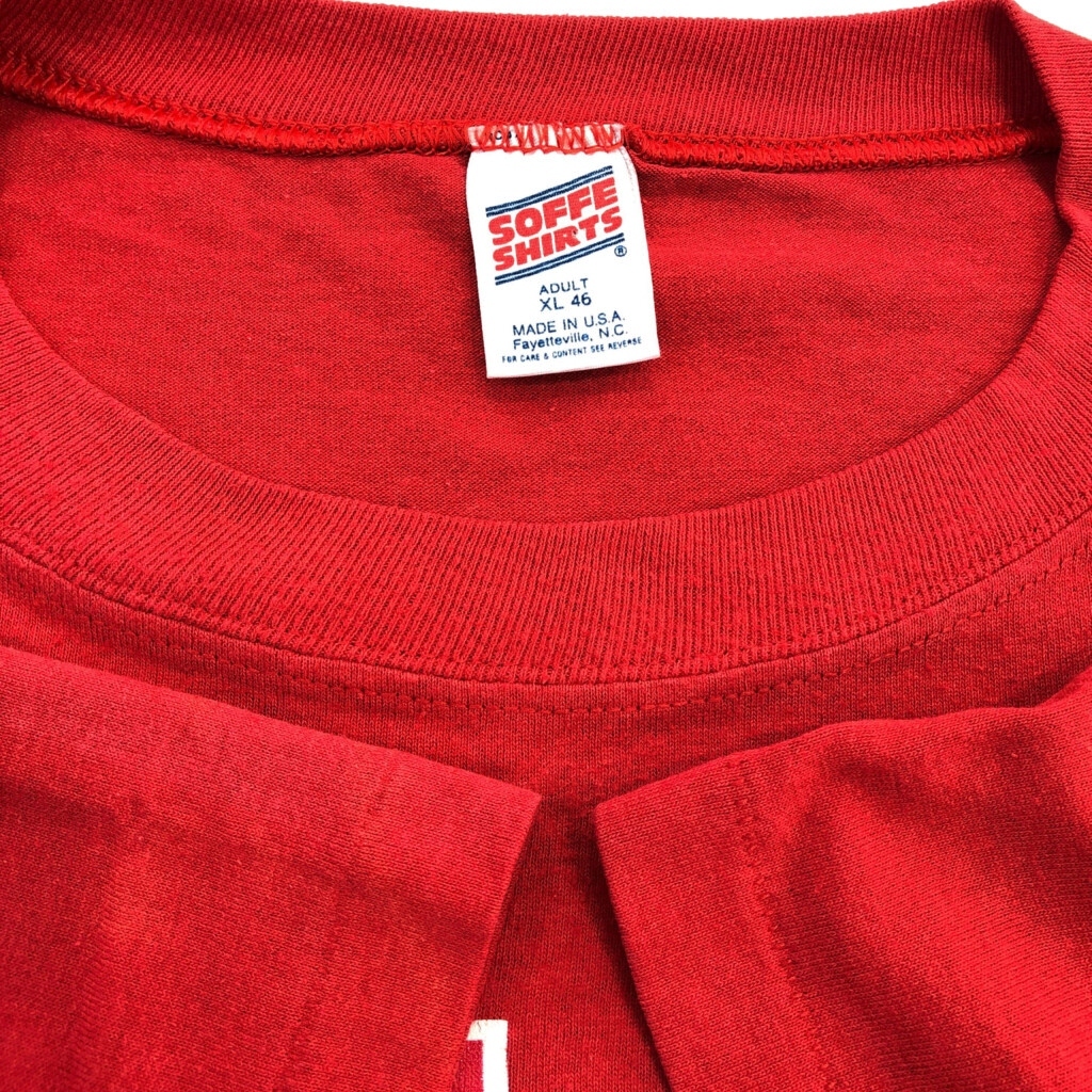 [商品管理番号] T6180 [ブランド] SOFFE/ソフィー [サイズ] XL [実寸サイズ] 肩幅:約47cm 着丈:約72cm 身幅:約59cm 袖丈:約23cm [主な素材] 表地 : ポリエステル [色] レッド [仕様] 生産国 : USA製 90年代 シングルステッチ [状態] 汚れ:腹部、腰、裾、裾裏地 特記事項:変色、色褪せ | |||