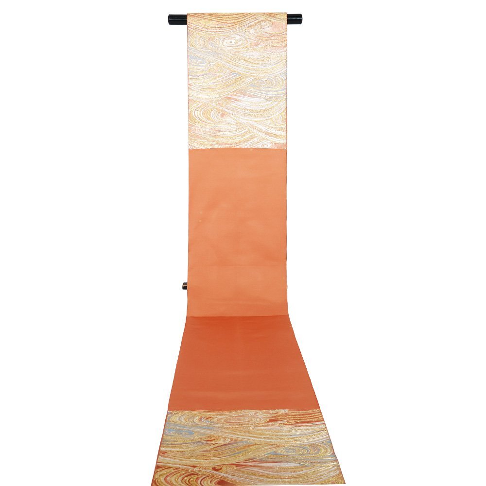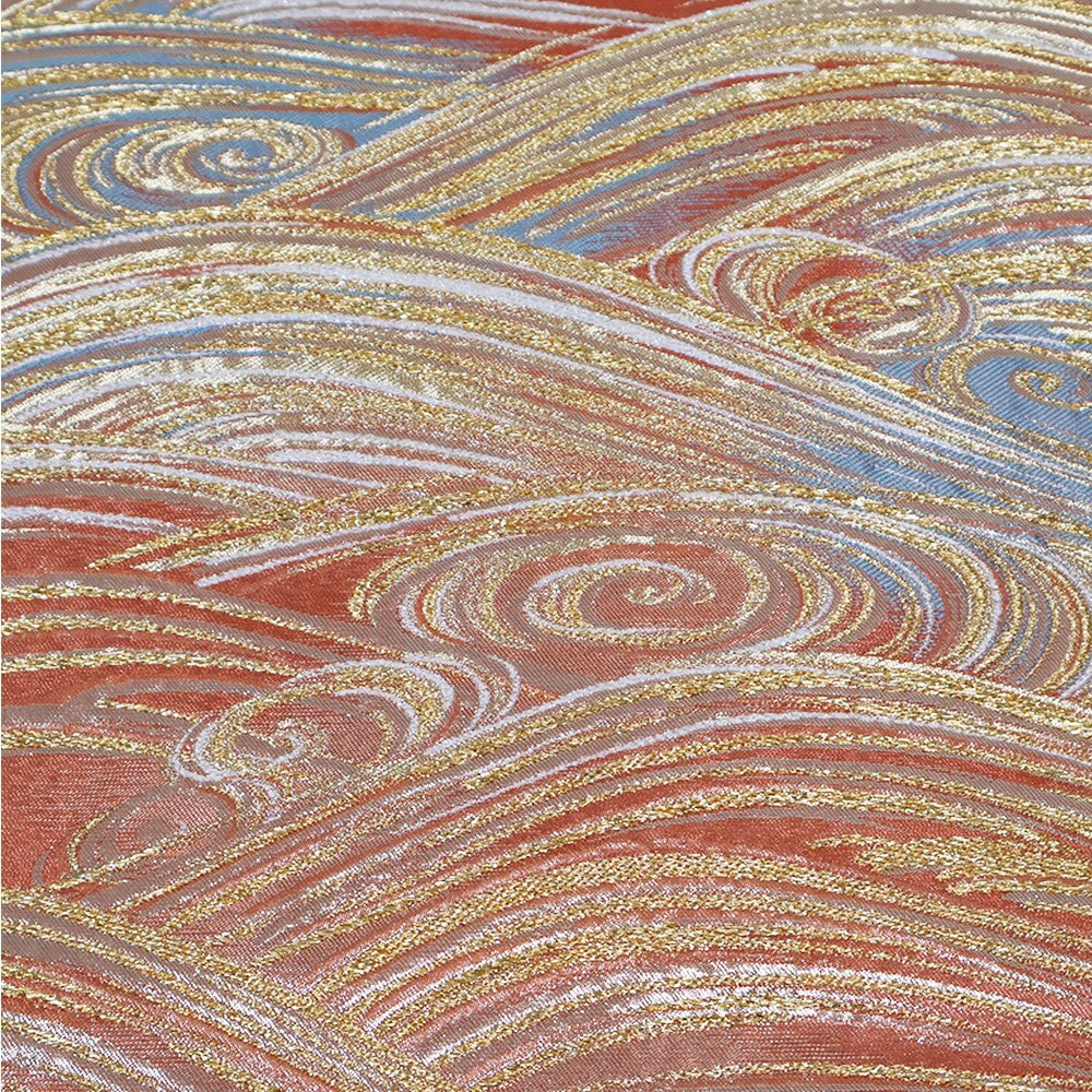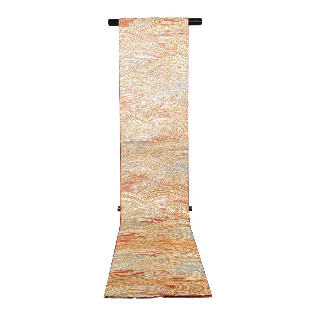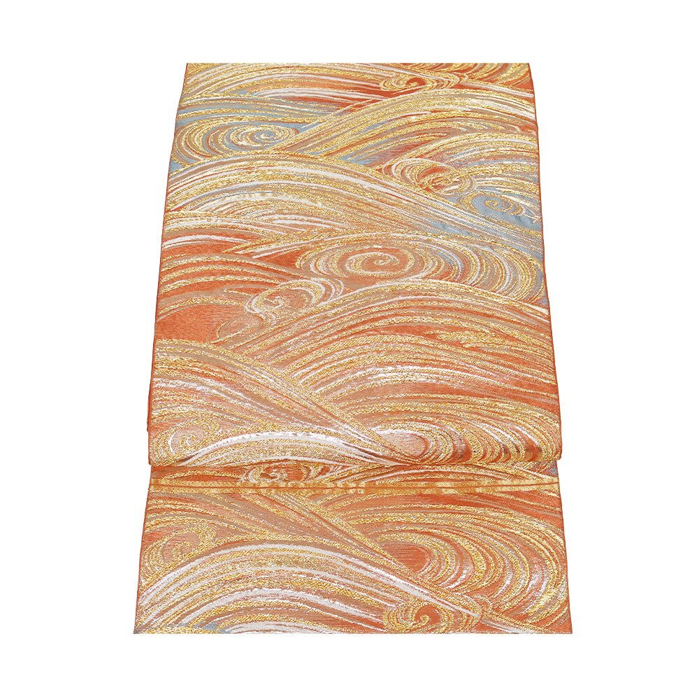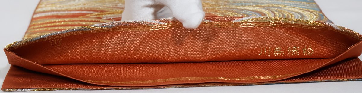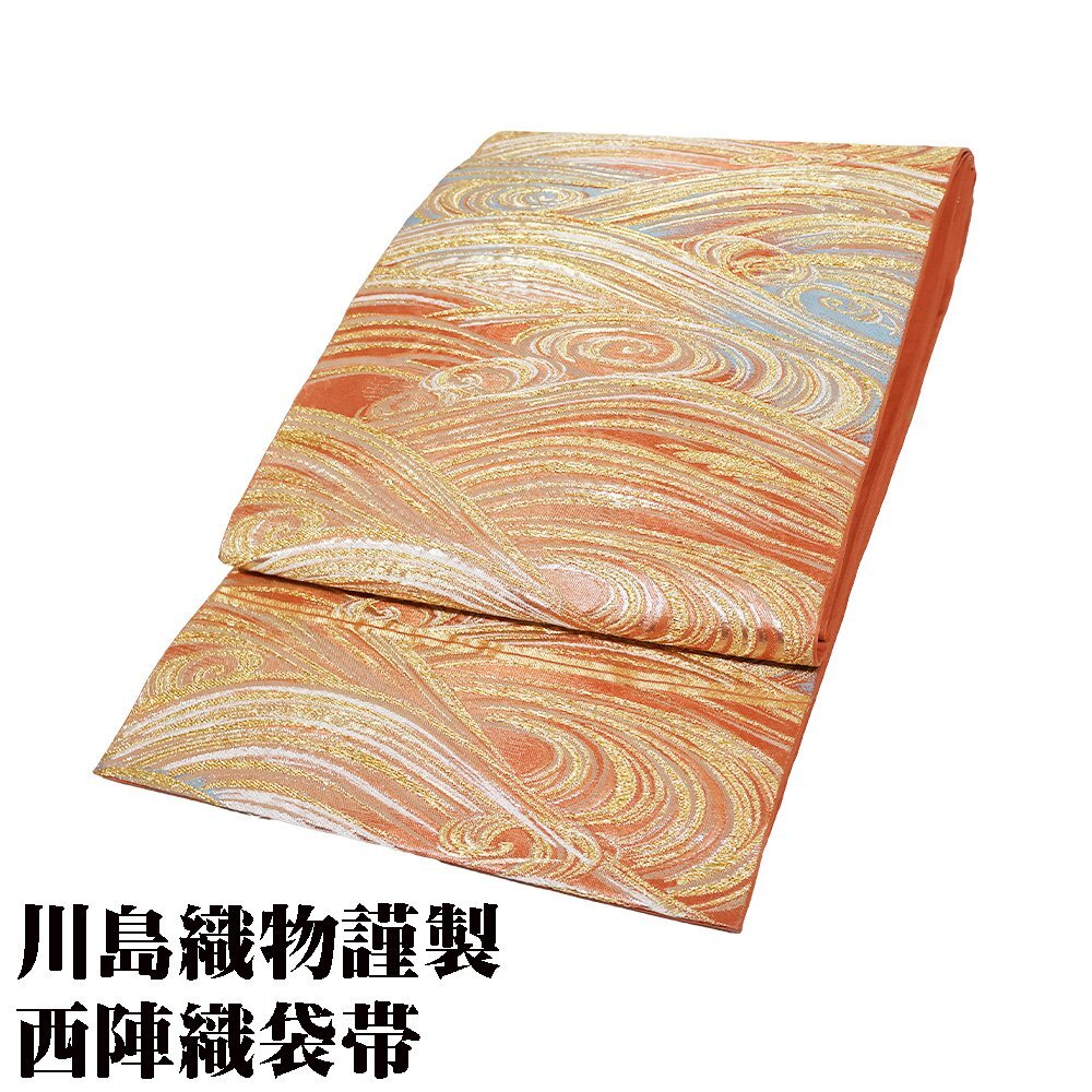 | 川島織物謹製 西陣織袋帯 橙色・朱色・紫・金・銀地 渦 落款入り 仕立て上がり |