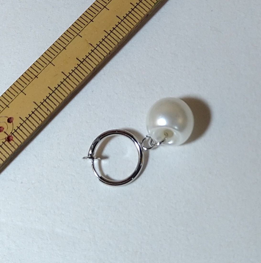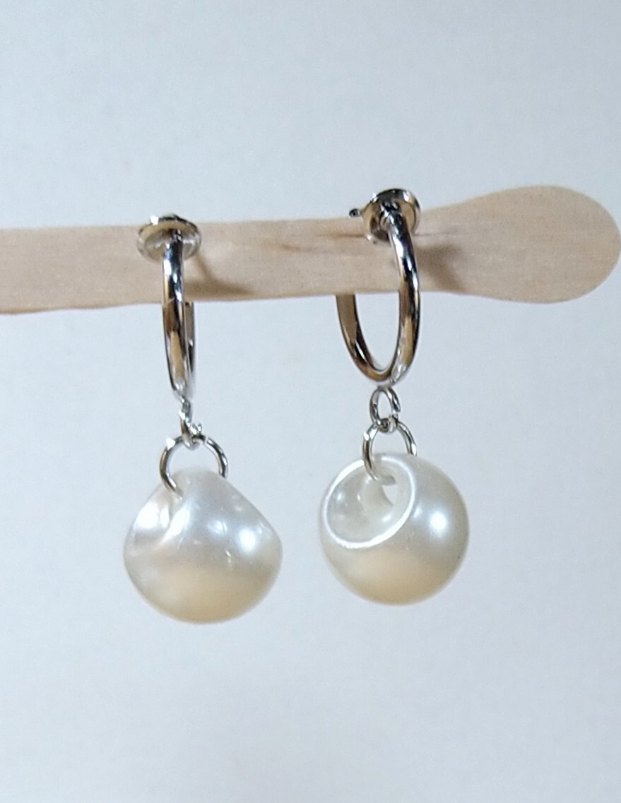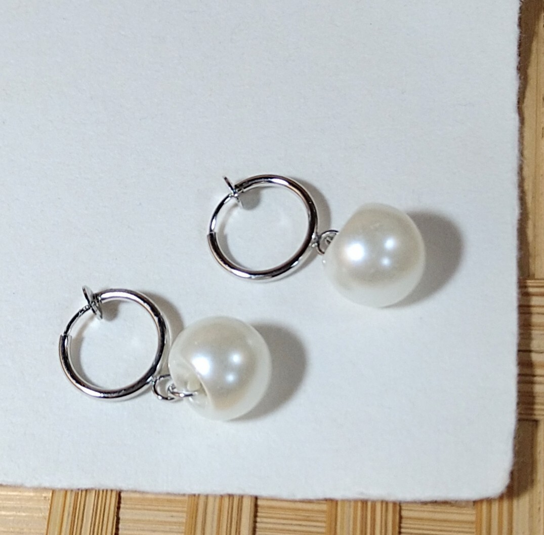 ■ハンドメイドイヤリング■パール調ビーズ ノンホールピアス フープ式 シルバー金具 雫ドロップ型